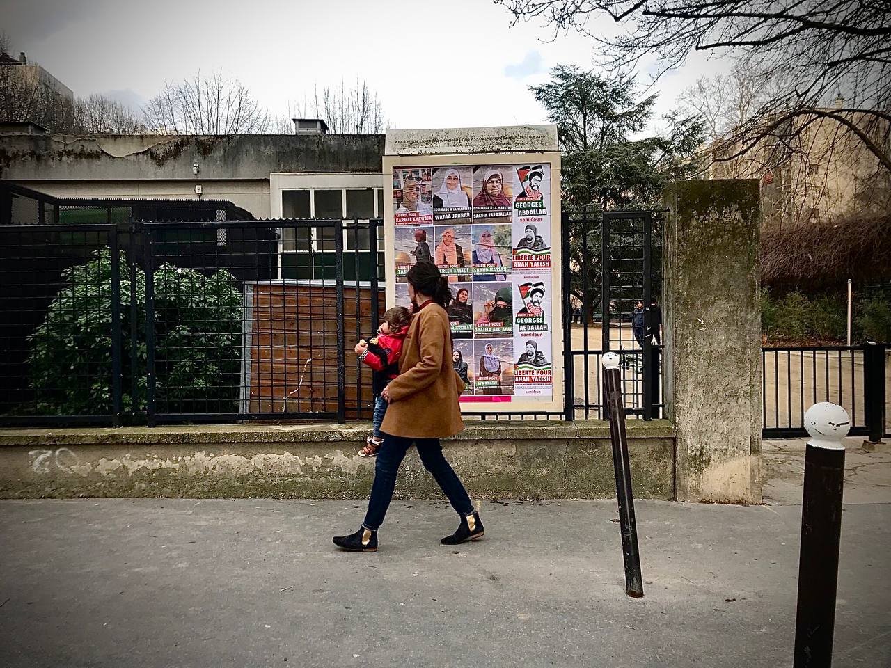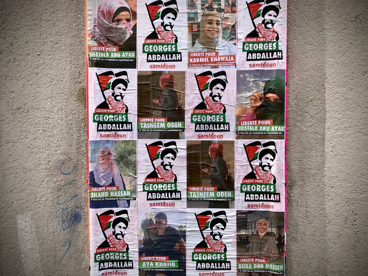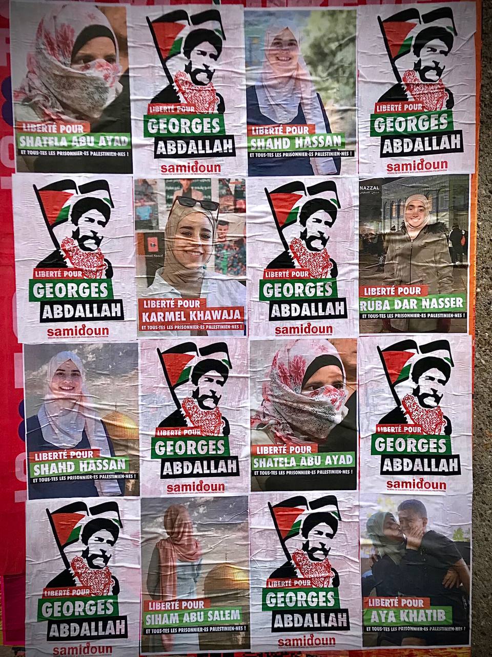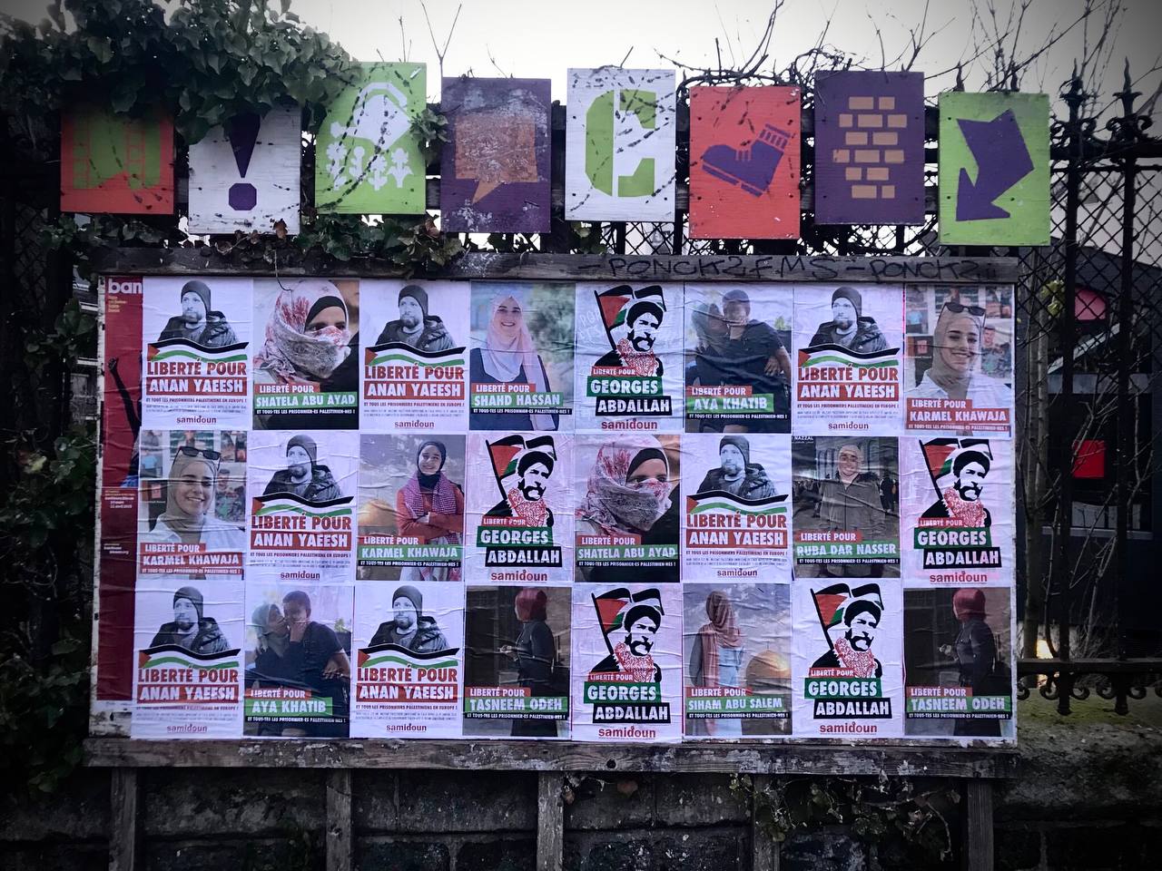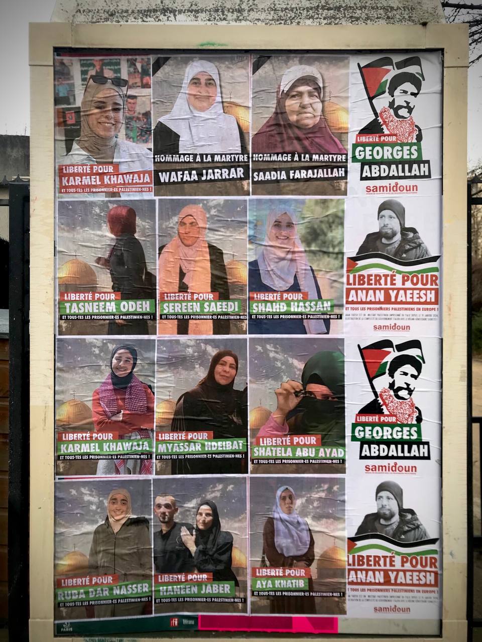 Aujourd’hui, nouveau collage dans les rues du 20e arrondissement de Paris, en solidarité avec les prisonnières palestiniennes, Anan Yaeesh et Georges Abdallah !