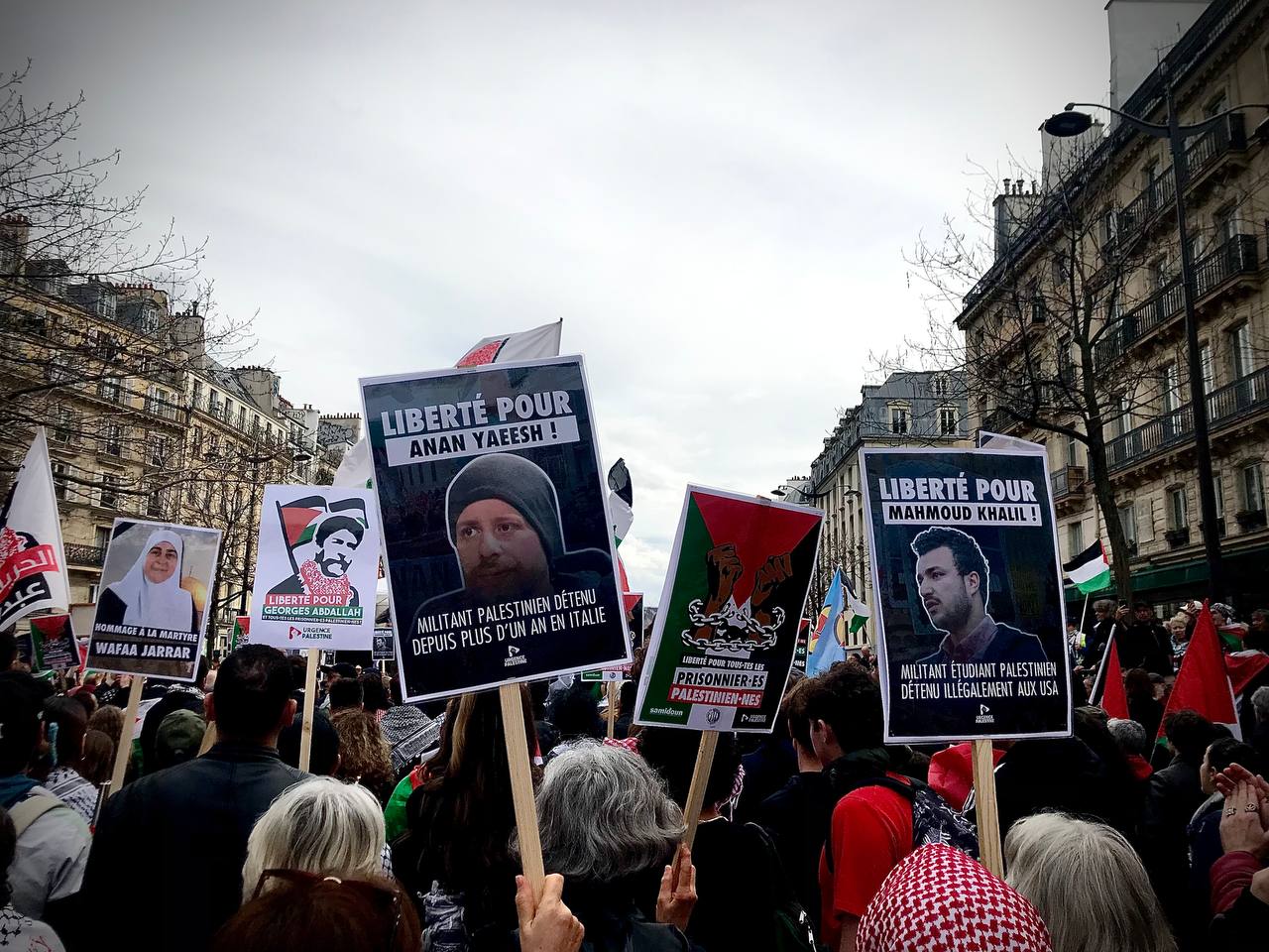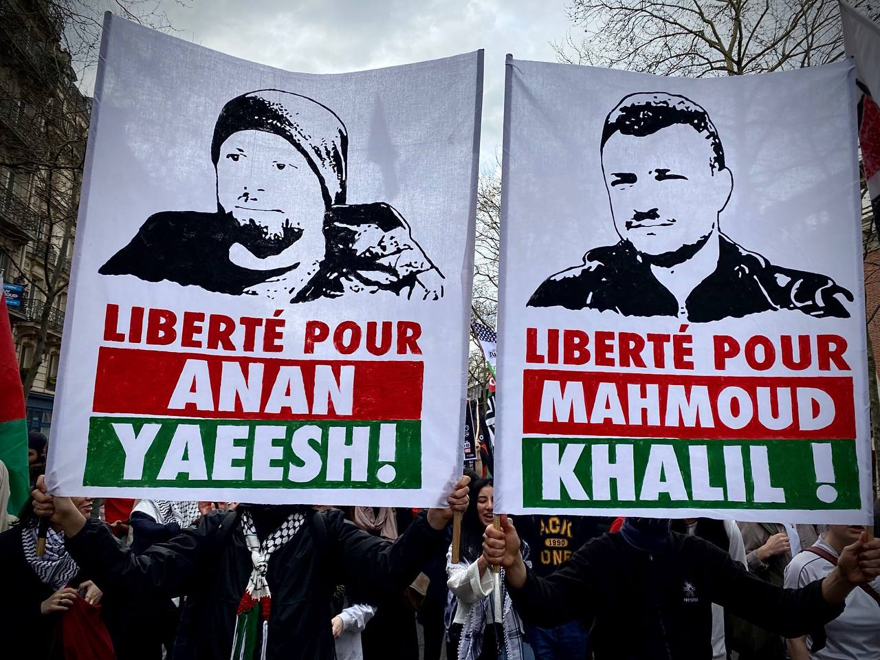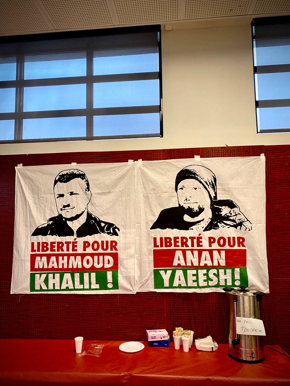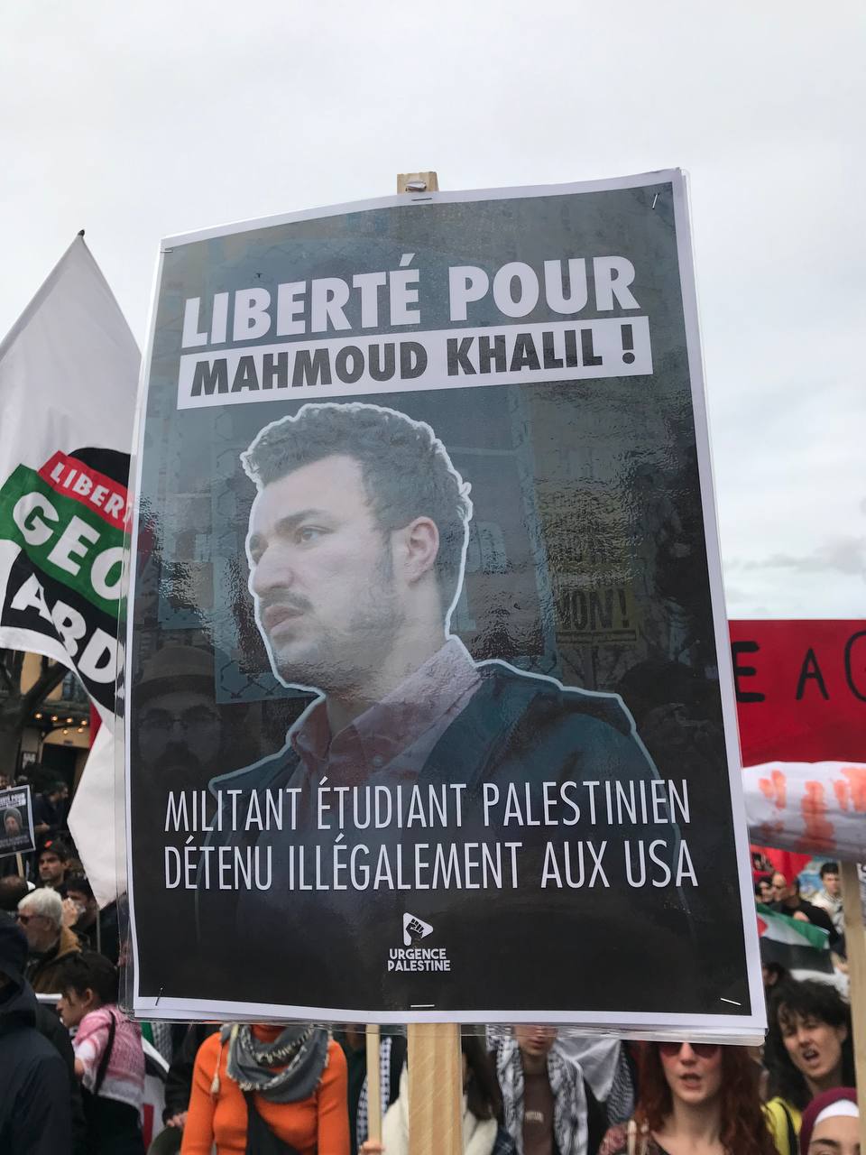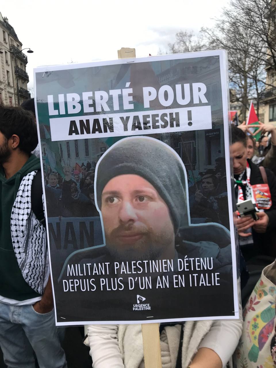 Plusieurs pancartes et des banderoles appelaient ainsi à la libération de Anan Yaeesh, militant italien incarcéré en Italie depuis janvier 2024 et dont le procès débutera le 2 avril prochain, et de Mahmoud Khalil, militant étudiant à Columbia, aux USA (Turtle Island) incarcéré et menacé de déportation par l’administration Trump.