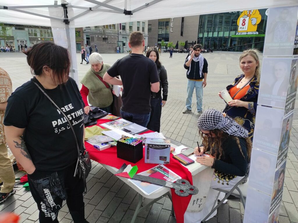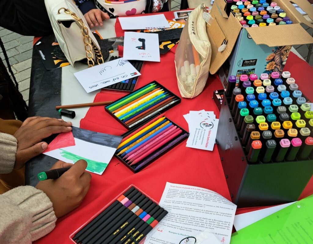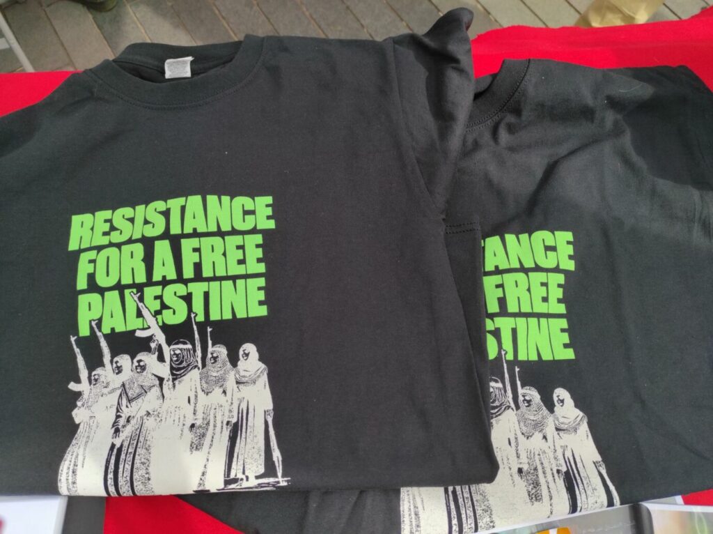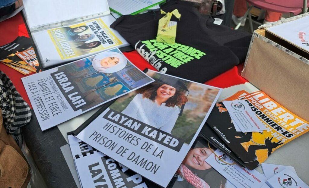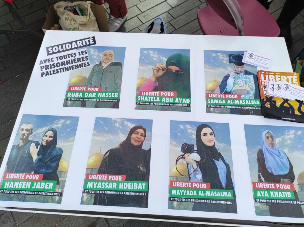 Au stand, les passant.e.s retrouvaient des foulards et bracelets en soutien à la Palestine, des T-shirts et des livres et pouvaient également adresser des cartes aux prisonnières palestiniennes.