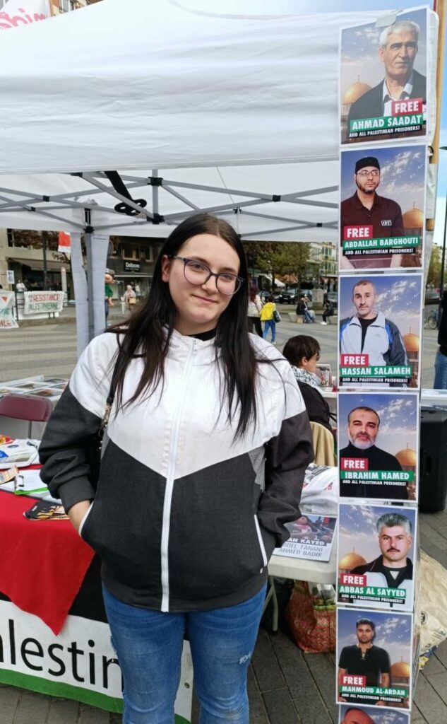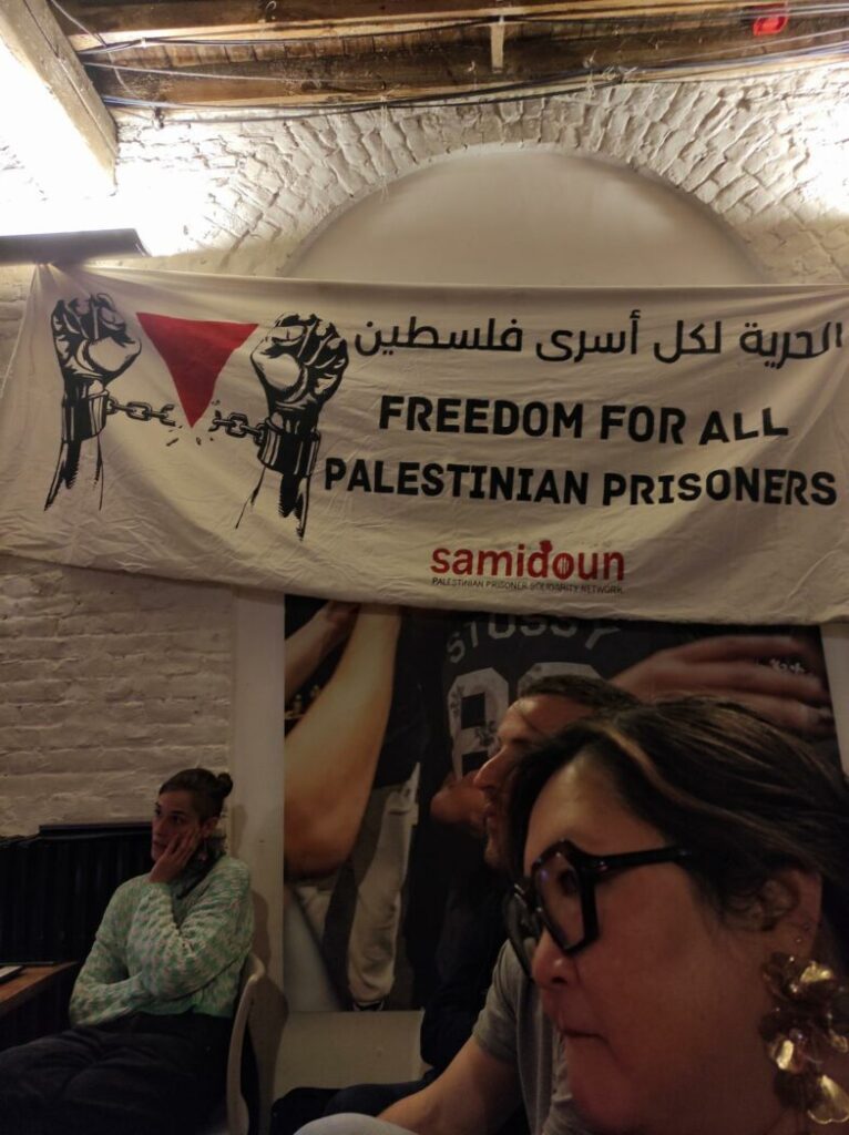 « Le 18 avril, j’ai participé à la conférence organisée par Samidoun et d’autres collectifs à Bruxelles (Pianofabriek – Saint-Gilles) à l’occasion de la Journée des prisonnier.e.s politiques palestinien.ne.s.