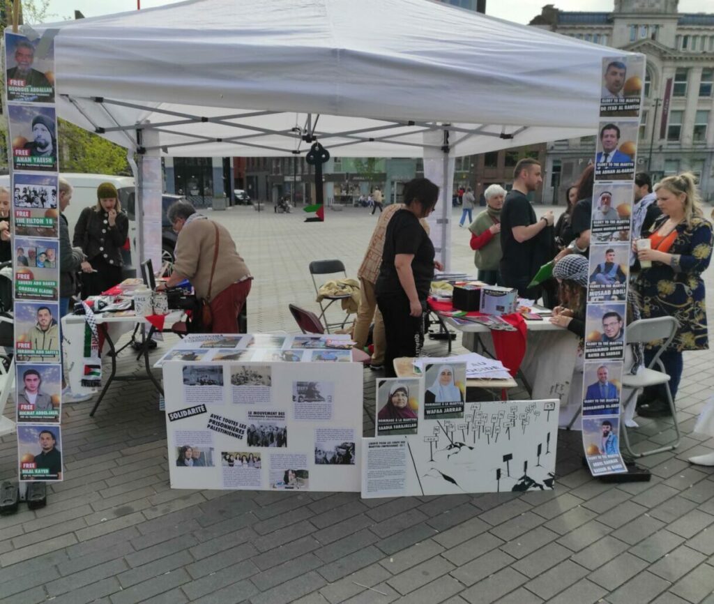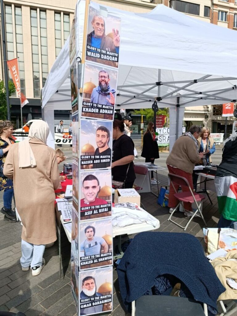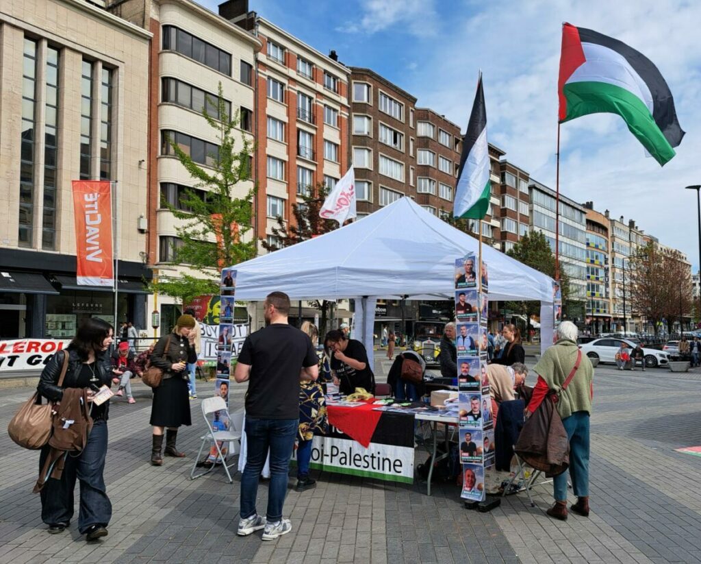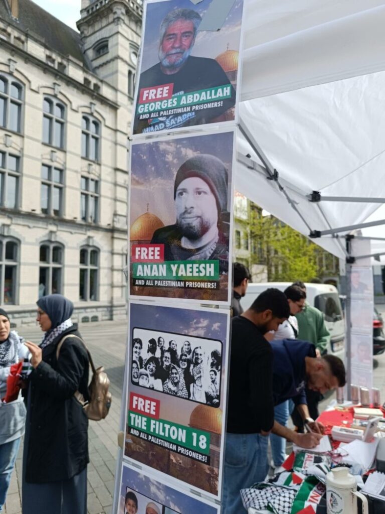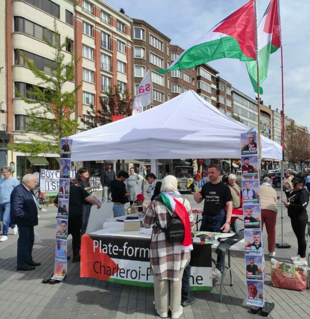 Le lendemain, samedi 19 avril, une équipe de la Plateforme s’est installée Place Verte à Charleroi. Une tonnelle a été dressée, décorée des photos des prisonnier.e.s palestinien.ne.s et des prisonnier.e.s martyr.e.s, ainsi que des calicots pour la libération de Georges Abdallah, d’Ahmad Sa’adat et de tou.te.s les prisonnier.e.s palestinien.ne.s. Les drapeaux palestiniens flottaient sur la place et les passants découvraient également des messages contre le génocide en cours, pour le boycott d’Israël et en faveur de la résistance palestinienne.