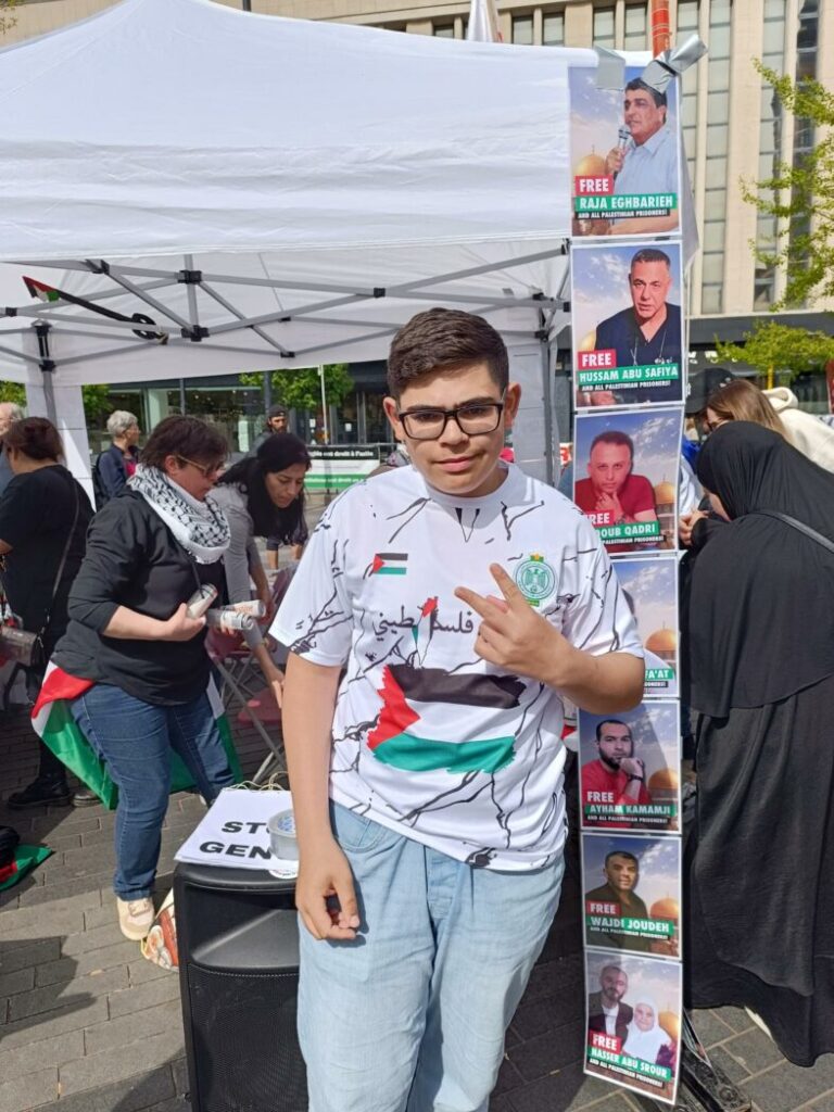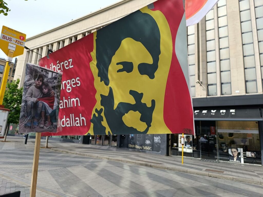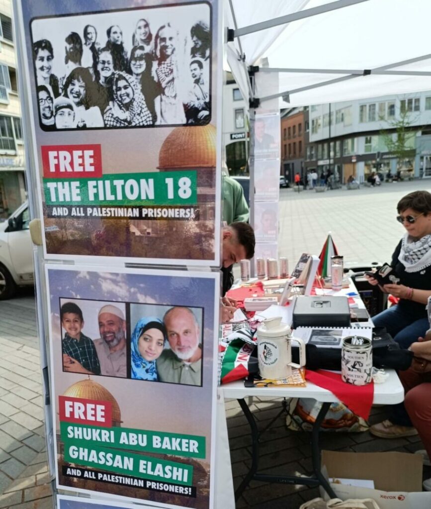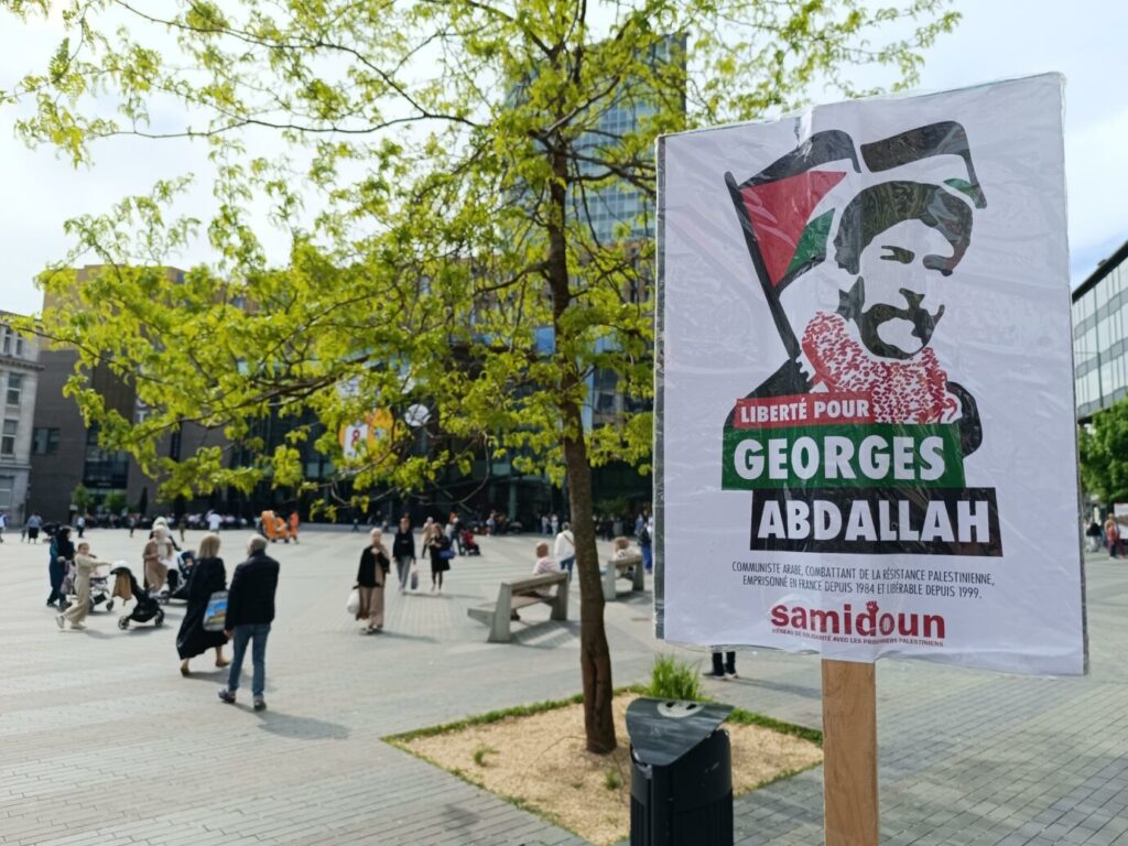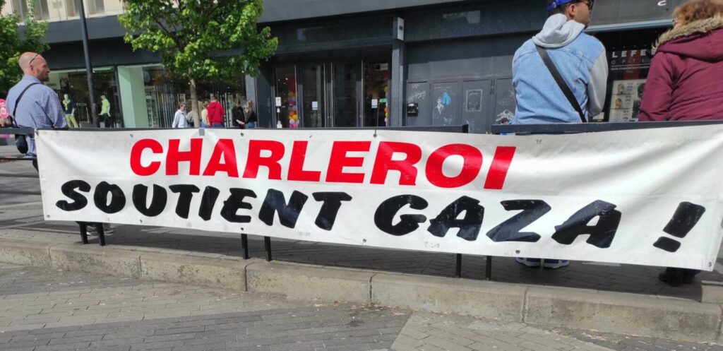 Le lendemain, samedi 19 avril, une équipe de la Plateforme s’est installée Place Verte à Charleroi. Une tonnelle a été dressée, décorée des photos des prisonnier.e.s palestinien.ne.s et des prisonnier.e.s martyr.e.s, ainsi que des calicots pour la libération de Georges Abdallah, d’Ahmad Sa’adat et de tou.te.s les prisonnier.e.s palestinien.ne.s. Les drapeaux palestiniens flottaient sur la place et les passants découvraient également des messages contre le génocide en cours, pour le boycott d’Israël et en faveur de la résistance palestinienne.