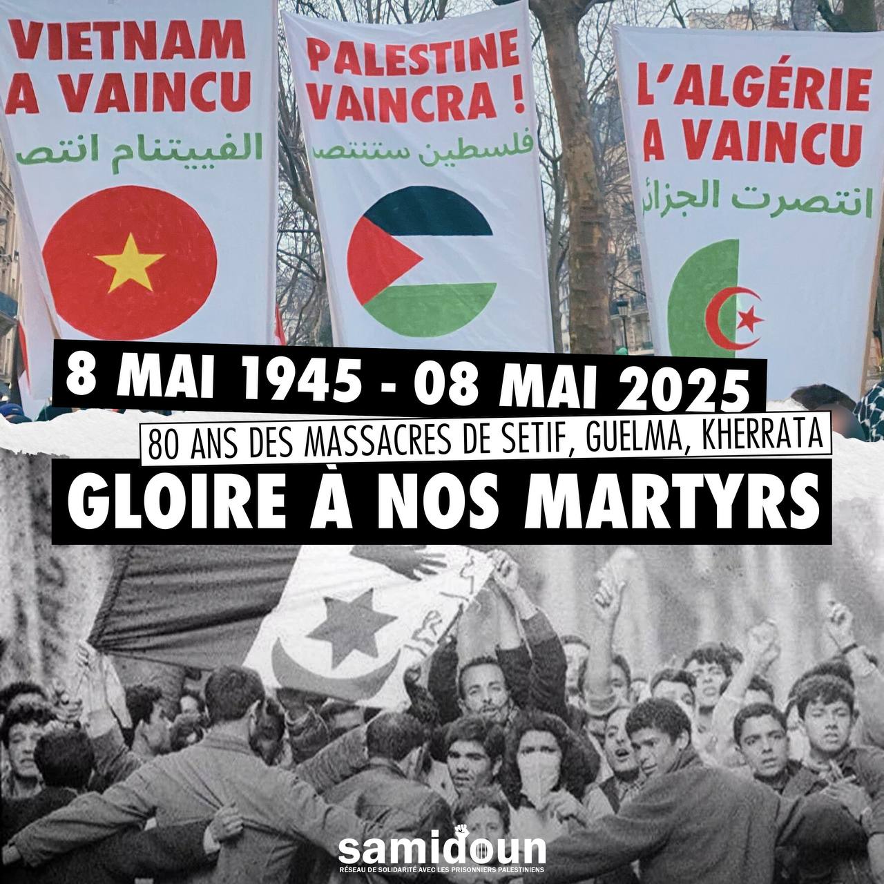Aujourd’hui, 8 mai 2025, nous commémorons les 80 ans du massacre de Setif, Guelma et Kherrata, au cours duquel 45 000 algérien·nes seront assassiné·es par les troupes coloniales françaises et des milices européennes, le 8 mai 1945 et les jours suivants.