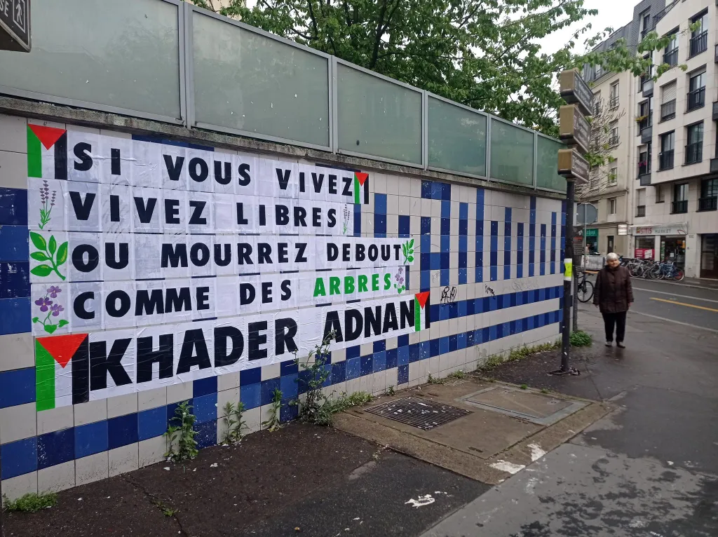 À Paris, d’autres posters et affiches ont également recouvert les murs de la capitale, pour rendre hommage au leader et militant Khader Adnan, reprenant ses mots : “Si vous vivez, vivez libres, ou mourrez debout, comme des arbres”