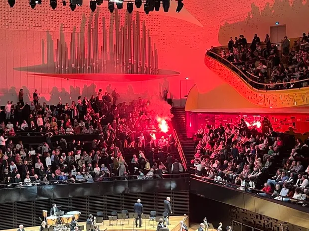 Ces actions menées par des militant·es courageux·ses à l’intérieur de la salle de concert visaient à dénoncer l’accueil de cet orchestre, outil de normalisation et de softpower du régime colonial génocidaire sioniste, après 2 ans d’une offensive génocidaire de l’armée sioniste sur Gaza, dont les images ont fait le tour du monde et ont été massivement partagées et diffusées.