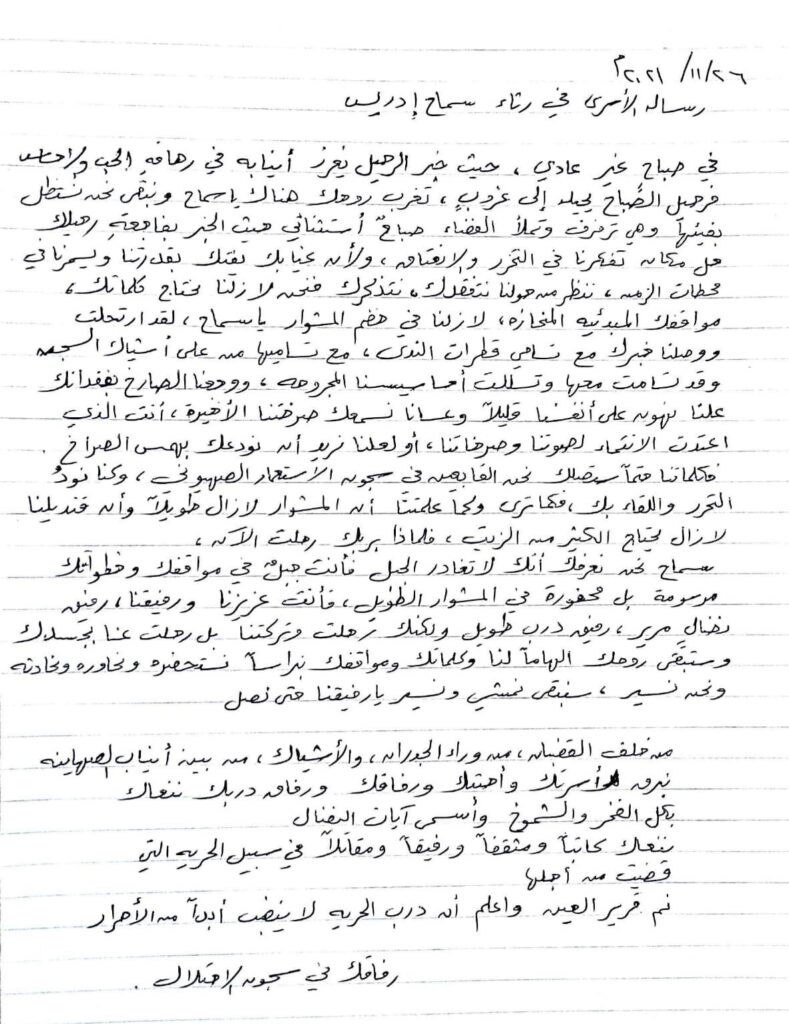 Le nostre parole ti raggiungeranno sicuramente. Siamo nelle prigioni del colonizzatore sionista e volevamo incontrarti. Lo vedi e, come ci hai insegnato, il viaggio è ancora lungo, e la nostra lampada ha ancora bisogno di molto olio, quindi perché te ne sei andato adesso?!