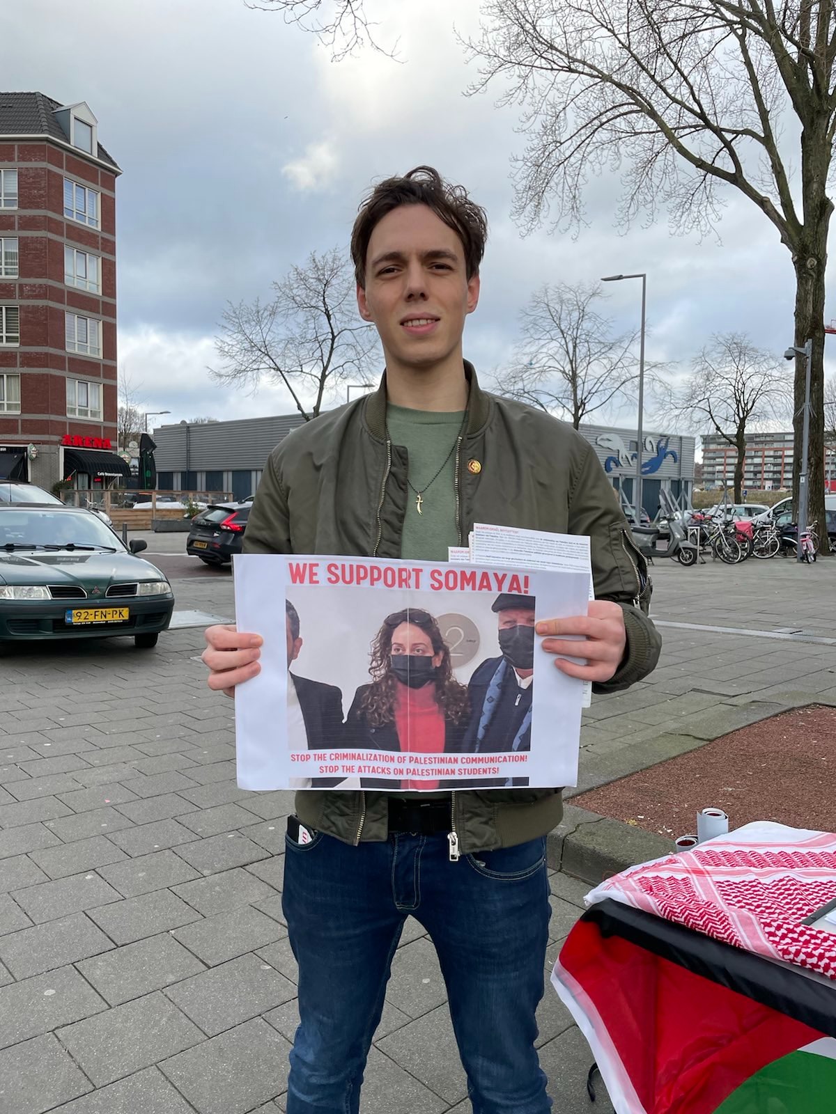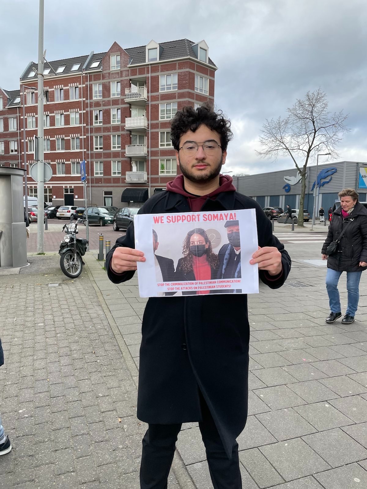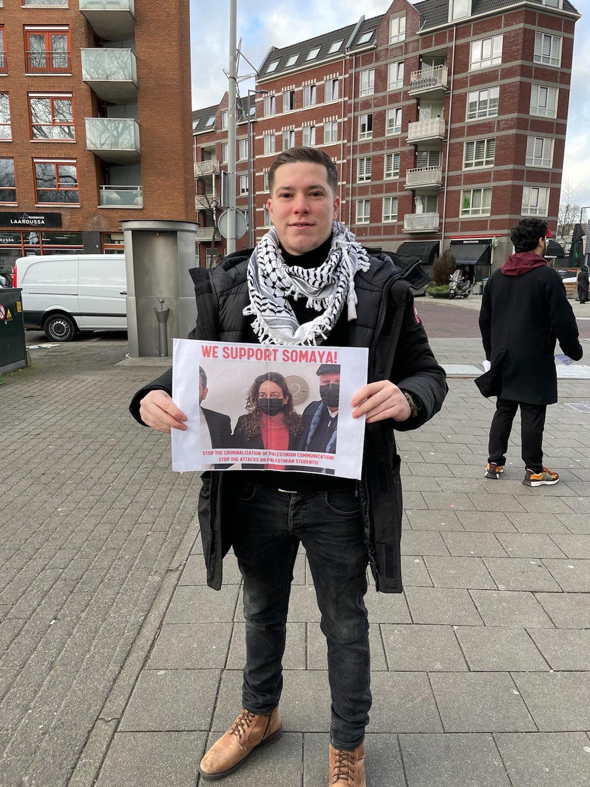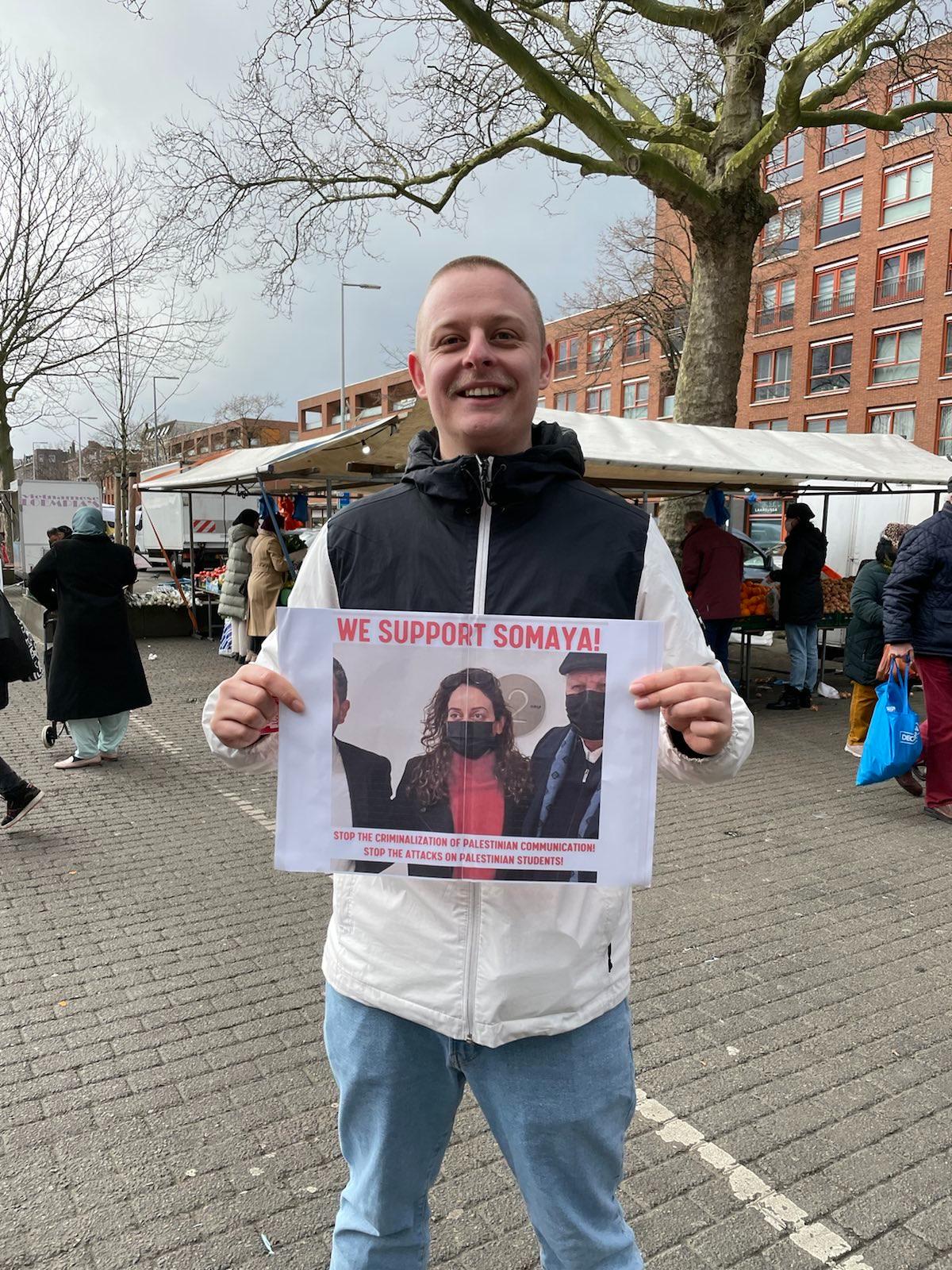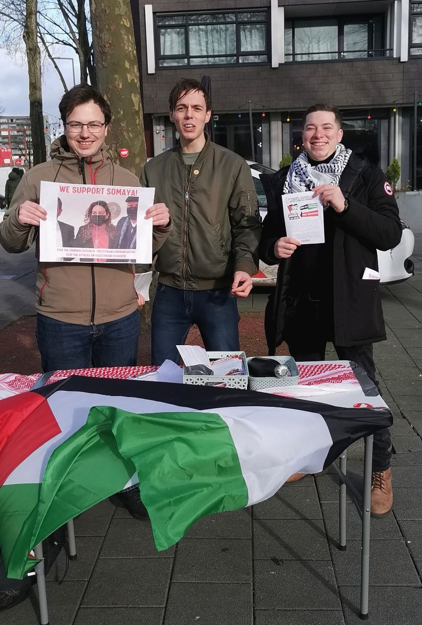 Daarnaast deelde Samidoun activisten flyers uit met informatie over de de boycot van Israël en de huidige situatie in Palestina, specifiek rond de Palestijnse vrijheidsstrijd in Sheikh Jarrah en Silwan.