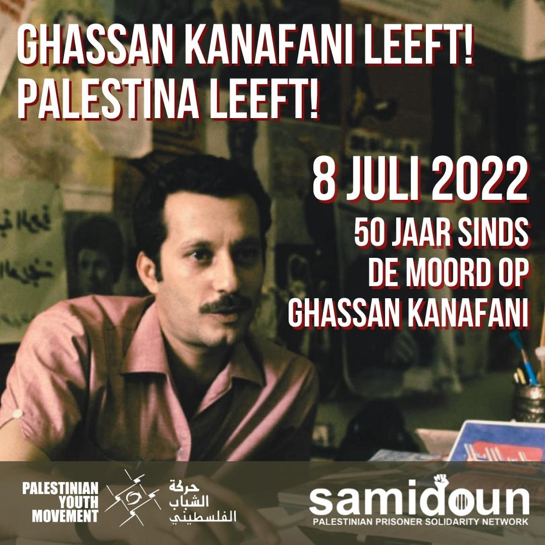 Op 8 juli 2022 is het vijftig jaar geleden dat Ghassan Kanafani werd vermoord, een politiek en cultureel icoon van het Palestijnse verzet en het Palestijnse volk. Kanafani werd op 8 juli 1972 vermoord, samen met zijn nich Lamees Najm, door een autobom geplaatst door de Mossad. We roepen alle Palestijnen, Arabieren en internationalistische supporters van Palestina op om deze dag te herinneren door er een dag van culturele en politieke strijd en verzet voor Palestina van te maken. Door acties en demonstraties te organiseren in steden over de hele wereld, en onze revolutionaire verbeeldingskracht te kanaliseren richting de teksten en afbeeldingen van het rechtvaardige verzet. Samen bevestigen we dat de erfenis van Kanafani springlevend is en dat ons volk nooit de strijd zal opgeven zonder totale bevrijding en terugkeer.