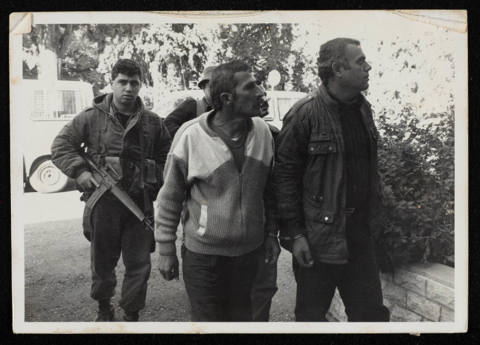 1989: Three leaders of the Popular Front for the Liberation of Palestine (PFLP), Abdel-Alim Daana to the right, Badran Jaber to the left and behind them is Rebhi Haddad in the middle, while two Israeli soldiers walk behind them in front of the Israeli High Court of Justice during one of their court sessions. Source: Palestinian Museum Digital Archive