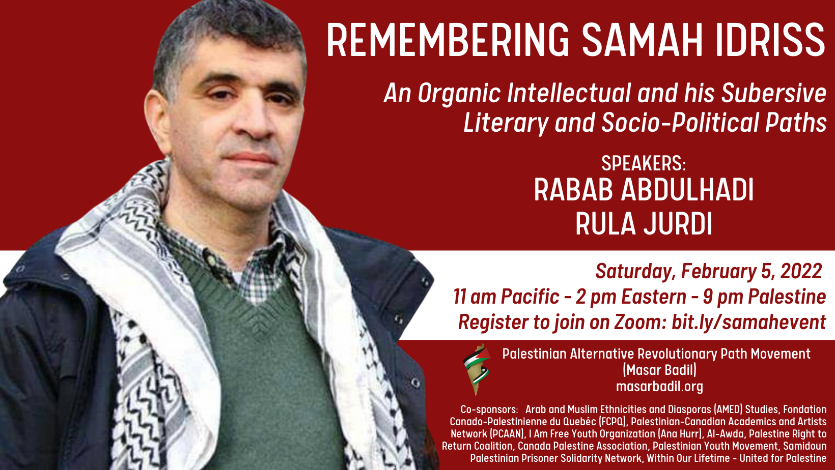 Saturday, February 5, 2022 11 am Pacific – 2 pm Eastern – 9 pm Palestine Register to join on Zoom: https://bit.ly/samahevent