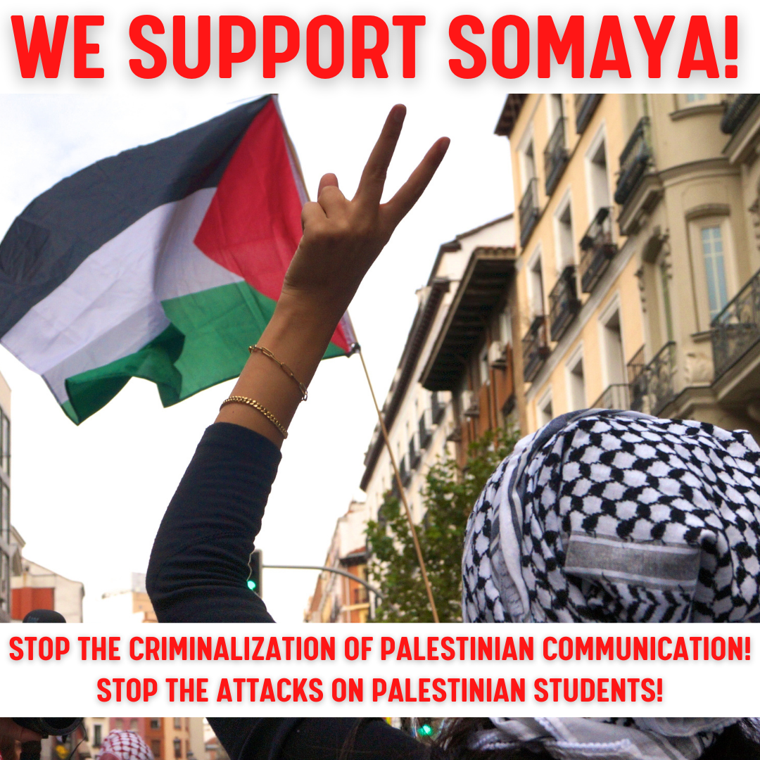 Issue a solidarity statement! Use this information to issue a statement from your solidarity group, trade union or student organization in support of Somaya and Palestinian students facing repression. If you have any questions, email us at samidoun@samidoun.net