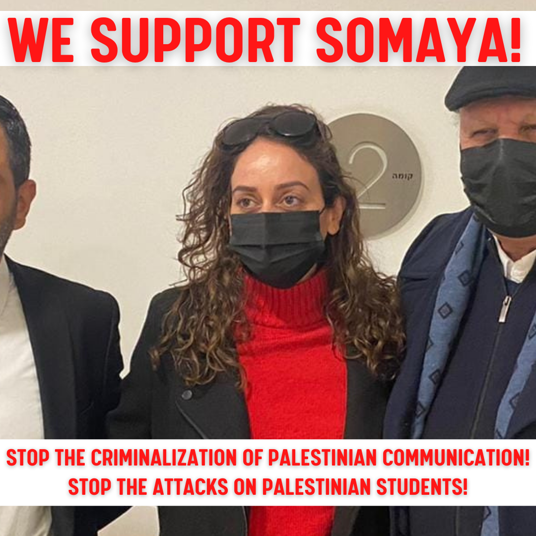 We urge all supporters of Palestinian rights, and all Palestinians — wherever you are — to stand with Somaya and demand an immediate end to the persecution of Palestinian connection and communication!