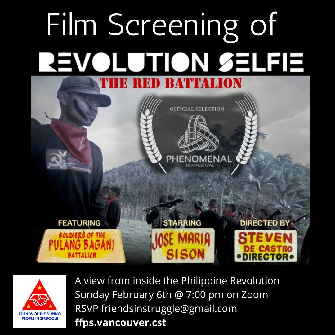 Film Screening of Revolution Selfie: The Red Battalion Sunday, February 6 at 7 PM Pacific time (10 pm Eastern time), on Zoom *RSVP to friendsinstruggle@gmail.com for the Zoom link* Hosted by Friends of the Filipino People in Struggle – Vancouver, CST