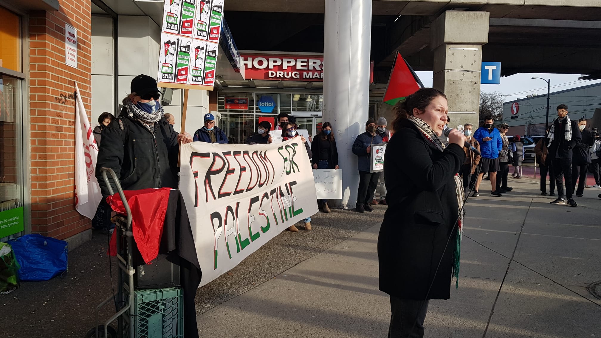 Charlotte Kates, international coordinator of Samidoun, opened the rally by expressing solidarity with Indigenous struggles for liberation and self-determination on Turtle Island, noting that Canadian settler colonialism has been in league with the Zionist project since its inception and continues to support Israel and its crimes against the Palestinian people on diplomatic, political, economic and even military levels.