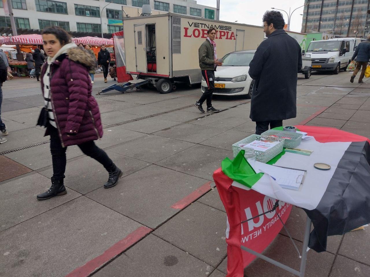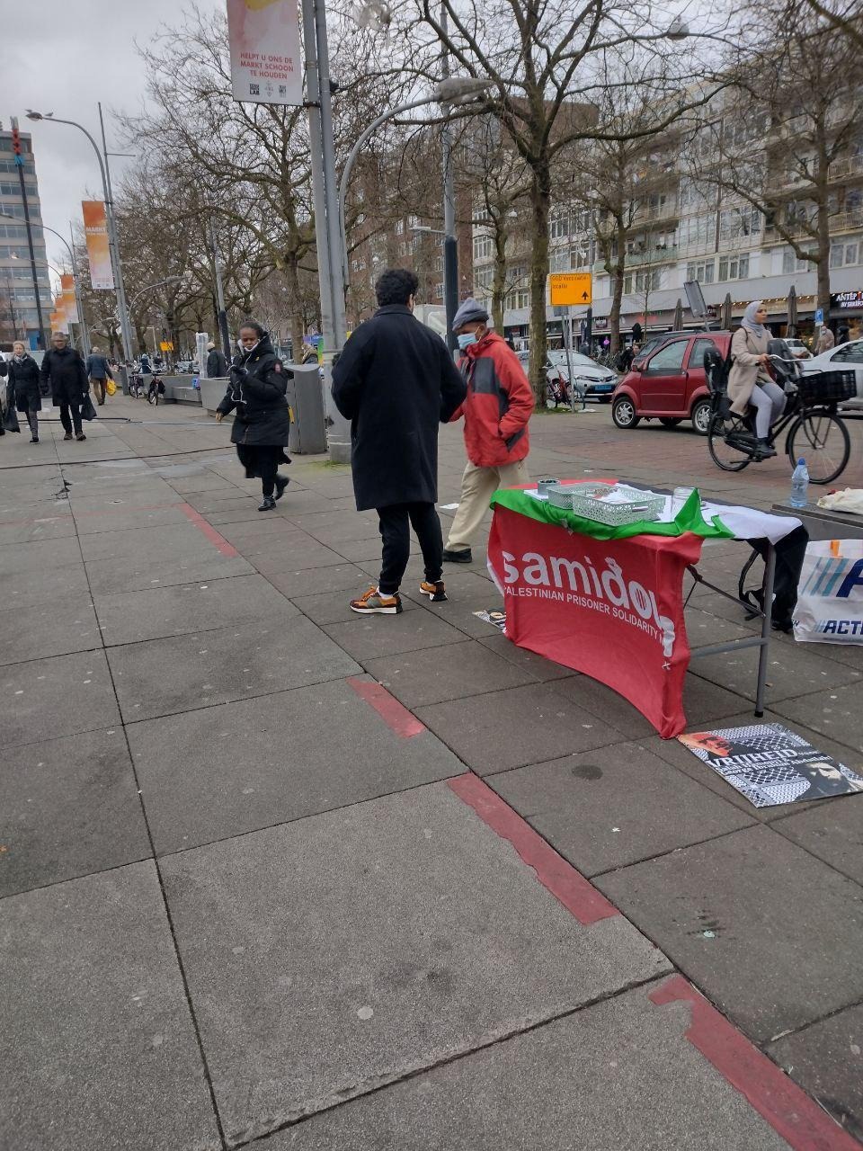 On Saturday, 22 January, Samidoun Nederland organized a Palestine stand next to a busy marketplace in Amsterdam-West. The stand was part of the international week of action to free Ahmad Sa’adat, the imprisoned General Secretary of the PFLP.