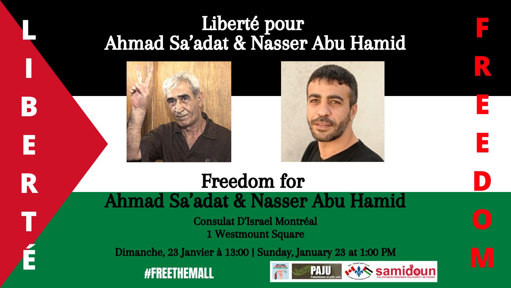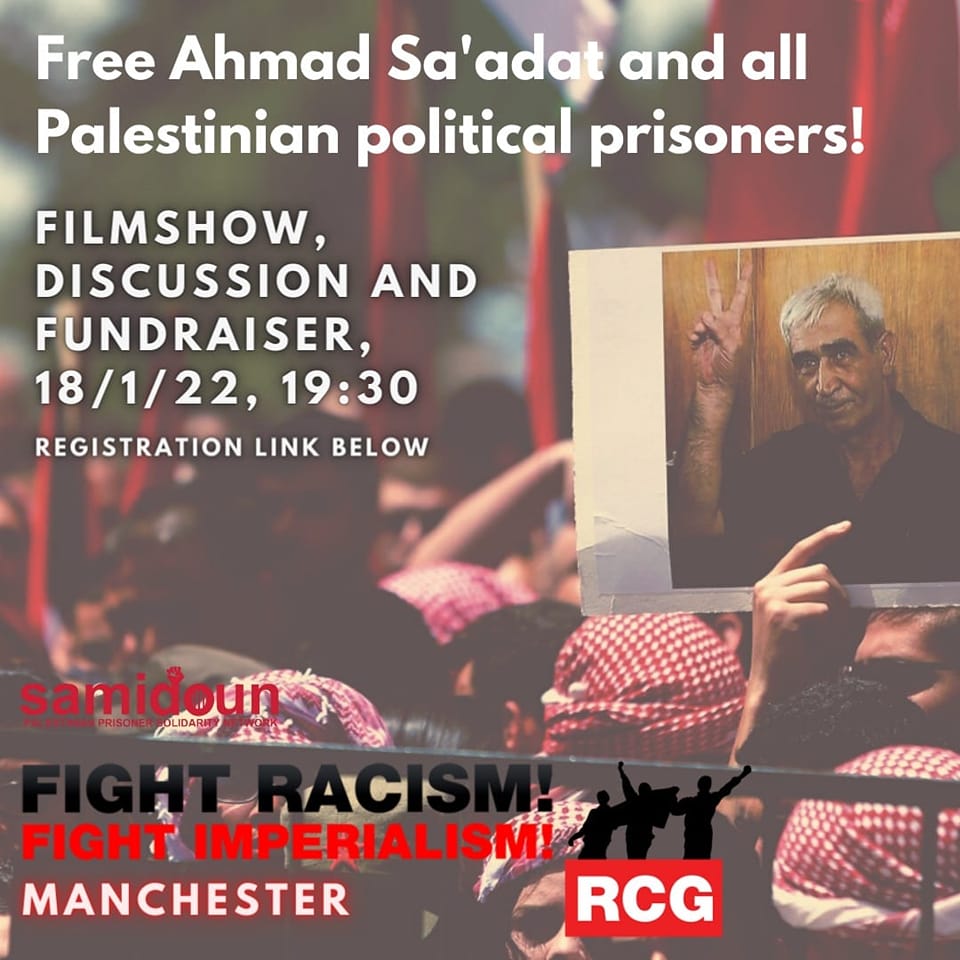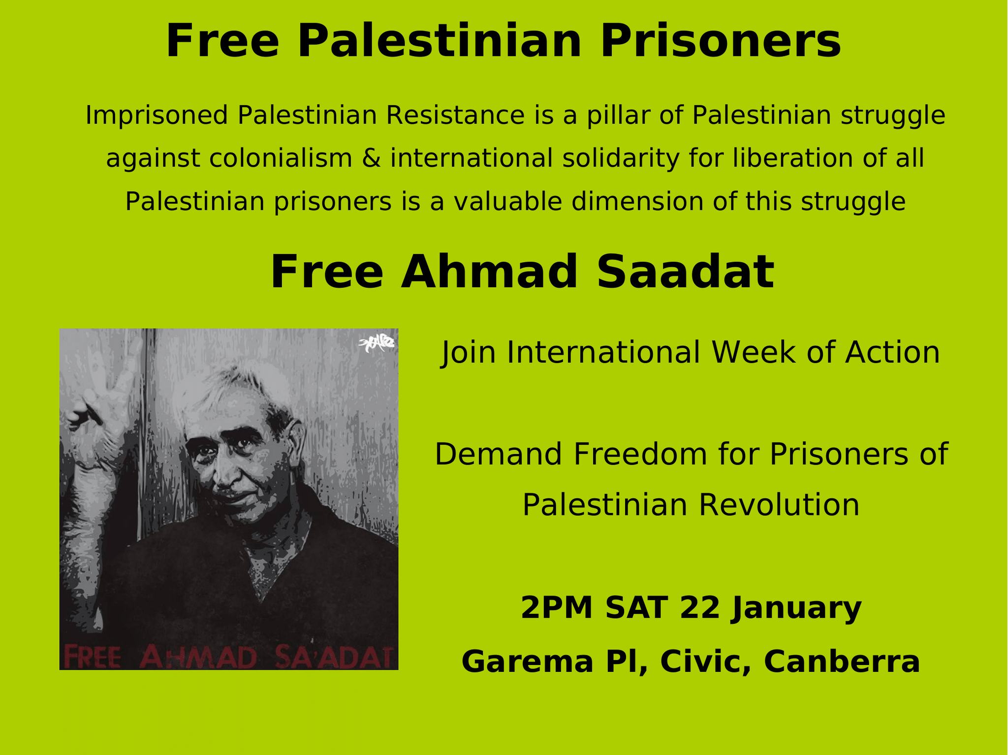 Please join this solidarity action to briefly discuss some of the aspects of the Palestinian anti-colonial struggle, the discernible lines between justice and injustice in this struggle, and the wider political context of imperialist war which situates Palestinian struggle firmly within a significant front against capitalism, colonialism and imperialism. We will use this time to distribute flyers with details of Ahmad Sa’adat’s case to the public.