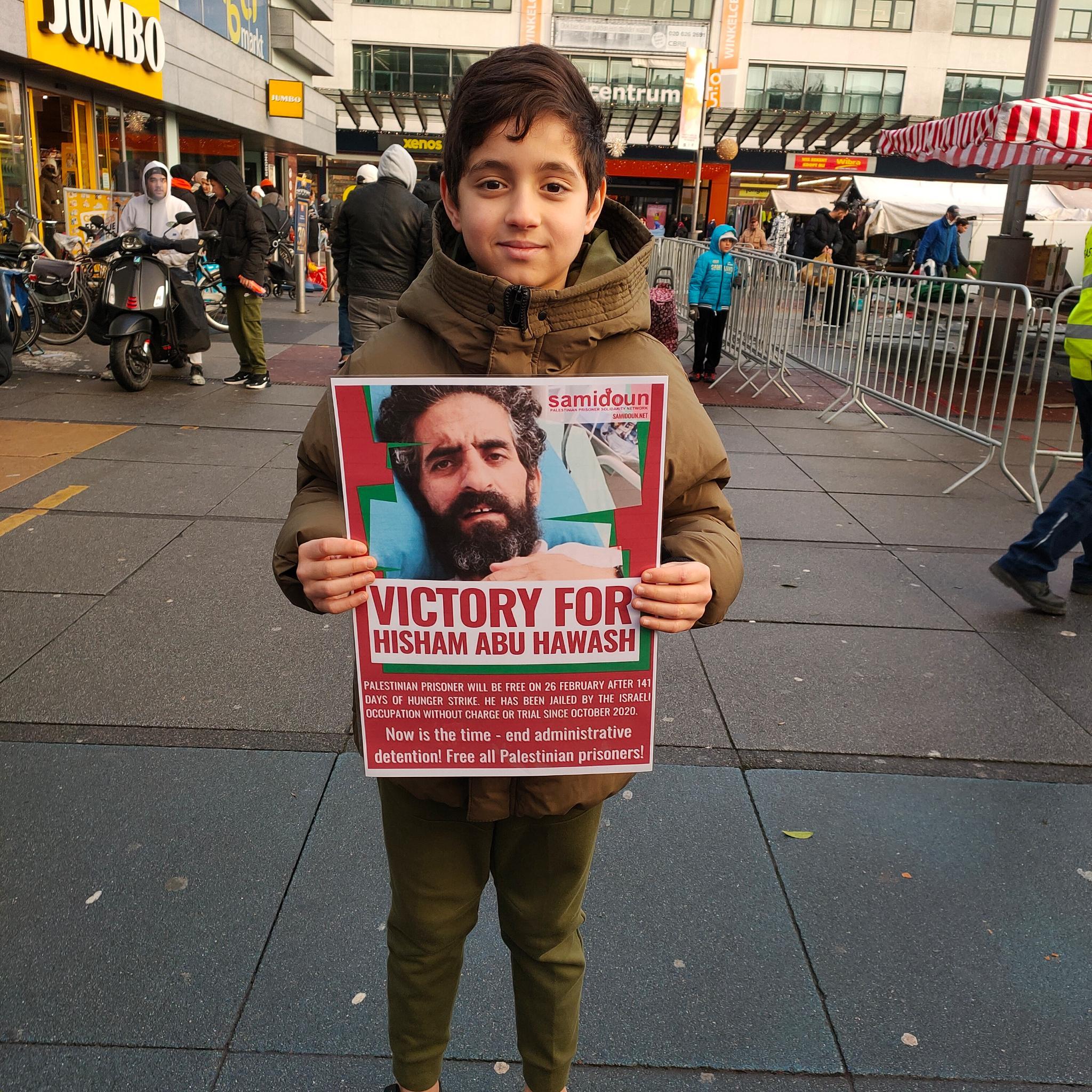 A 12-year-old Palestinian child, Lara, from Gaza, spoke at the event, recalling the story of Abu Hawash’s hunger strike as well as other recent Palestinian hunger strikers who won their freedom from administrative detention. She declared, “We are gathering in support of all of our prisoners who continue their struggles in different ways, not least of which is the battle of empty stomachs.”