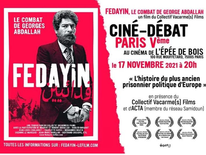 The day ended with the premiere of “Fedayin: Georges Abdallah’s Fight” in Lebanon, at the Al Madina Theater in Beirut’s Hamra district. Over 120 people participated in the event, which concluded with a discussion about the current situation of the mobilization to free the longest-held political prisoner in Europe, moderated by a representative of the film directors and Robert Abdallah, spokesperson of the Lebanese Campaign for the Liberation of Georges Abdallah.