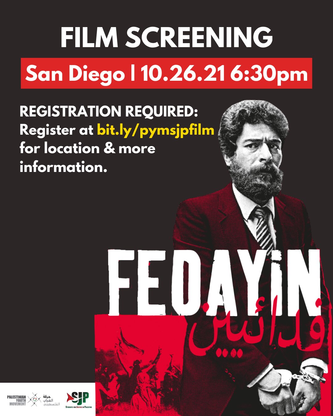The Palestinian Youth Movement San Diego and Students for Justice in Palestine SDSU are joining the call to action by organizing a public screening of the new and acclaimed film, “Fedayin,” which chronicles the life and detainment of Georges Abdallah.