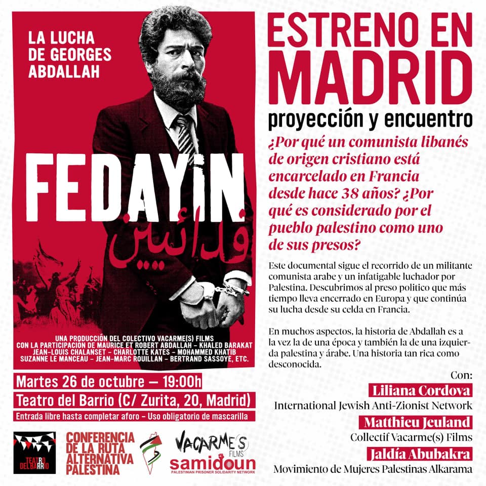 Please join Teatro del Barrio, the Alternative Palestinian Path (Masar Badil), Collectif Vacarme(s) Films and Samidoun España for the premiere screening in Madrid of “Fedayin: Georges Abdallah’s Fight” on Tuesday, 26 October at 7 pm.