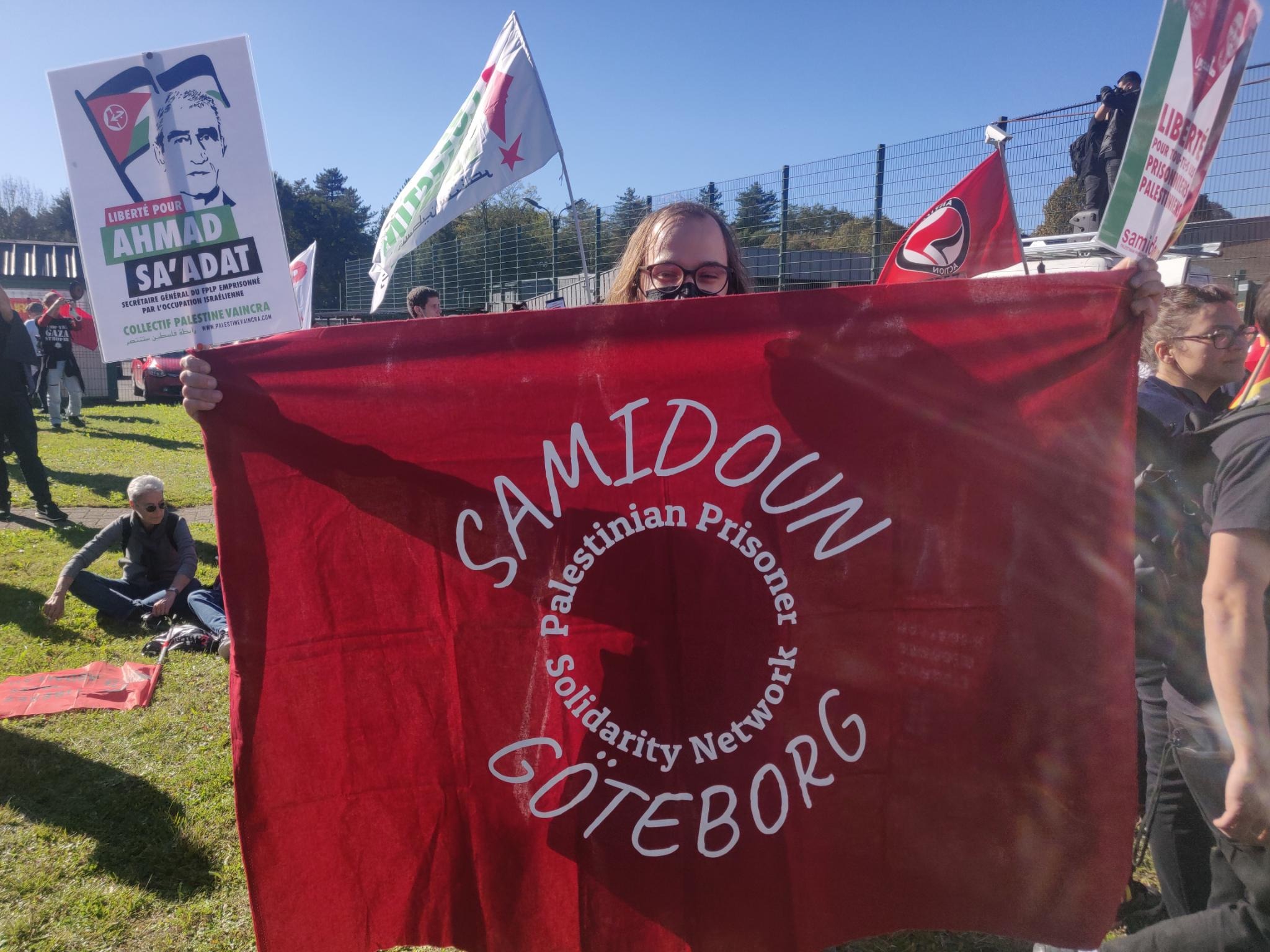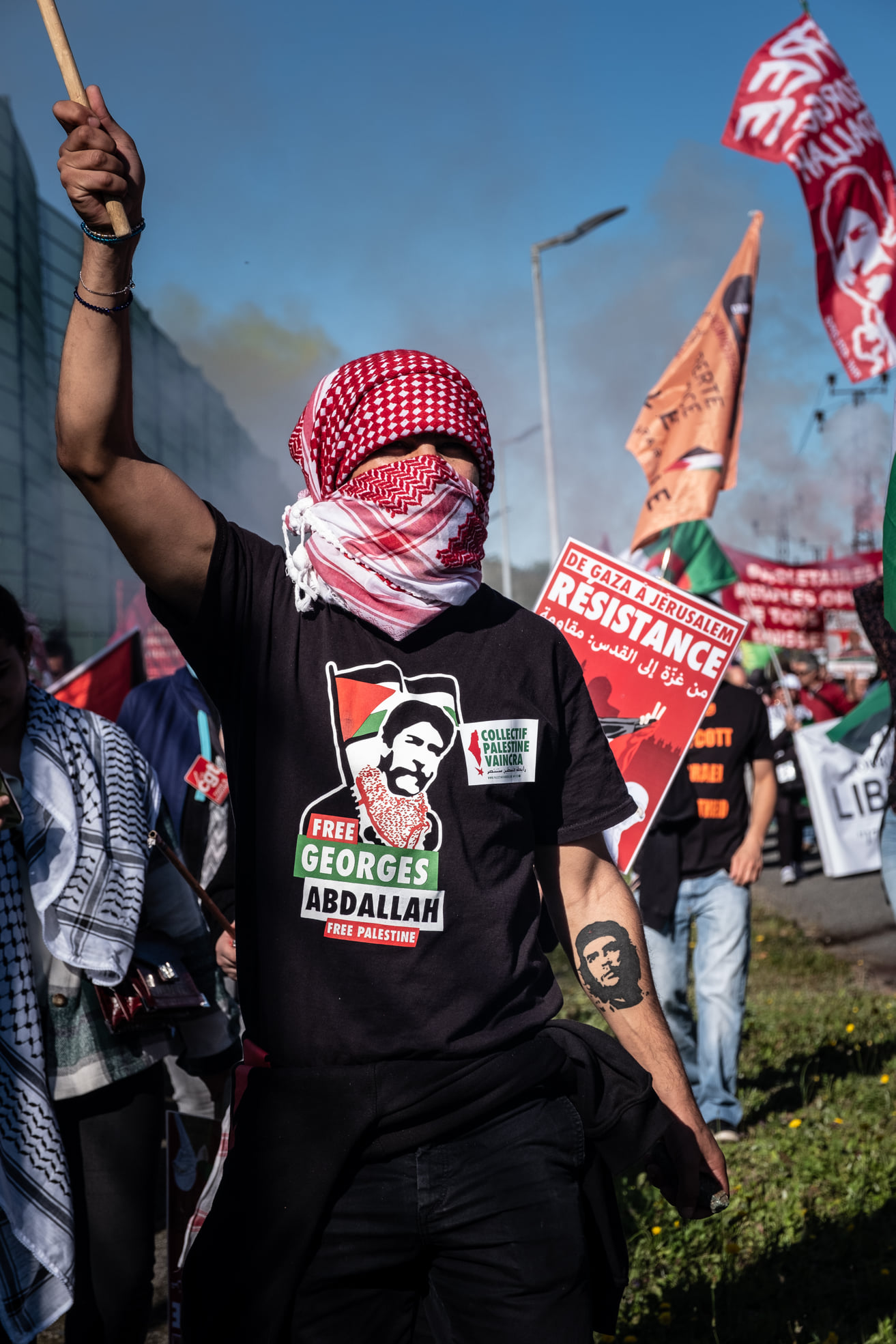The Collectif Palestine Vaincra, a member organization of the international Samidoun Network, organized a contingent of the march around the slogan “Freedom for Georges Abdallah! Freedom for Palestine!” which brought together many participants. Samidoun Göteborg was present in the march as well as delegations from Secours Rouge International. Many Palestinian flags and flags of the Collectif were waved as well as placards supporting Palestinian resistance, calling for the release of Palestinian prisoners and demanding the boycott of Israel.