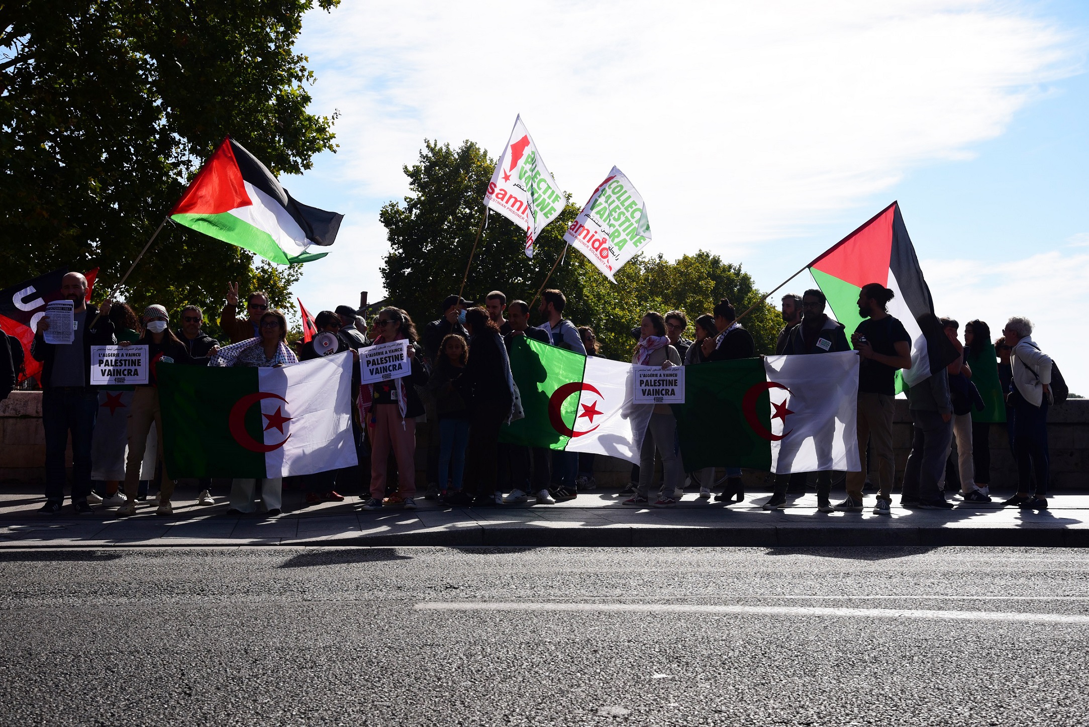 Algerian flags were displayed on the Pont-Neuf, and a representative of the Collectif spoke, saluting the resistance and the martyrs of 17 October, as well as the Algerian revolution as a whole. “After 132 years of French colonialism ,the sacrifice of our martyrs made it possible to liberate ourselves and I can say today that I am proud to be Algerian. The fight continues in particular against the Zionist colonization of Palestine,” she affirmed. She emphasized that the struggles of the Algerian and Palestinian people confront the same enemies, imperialism and colonialism.