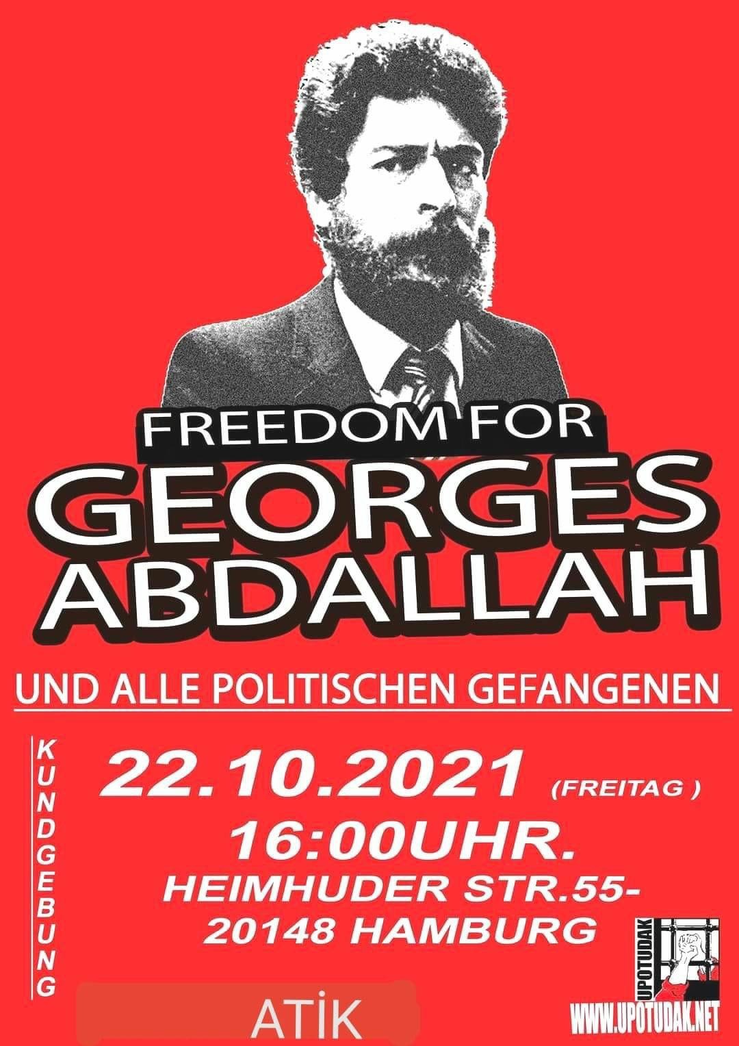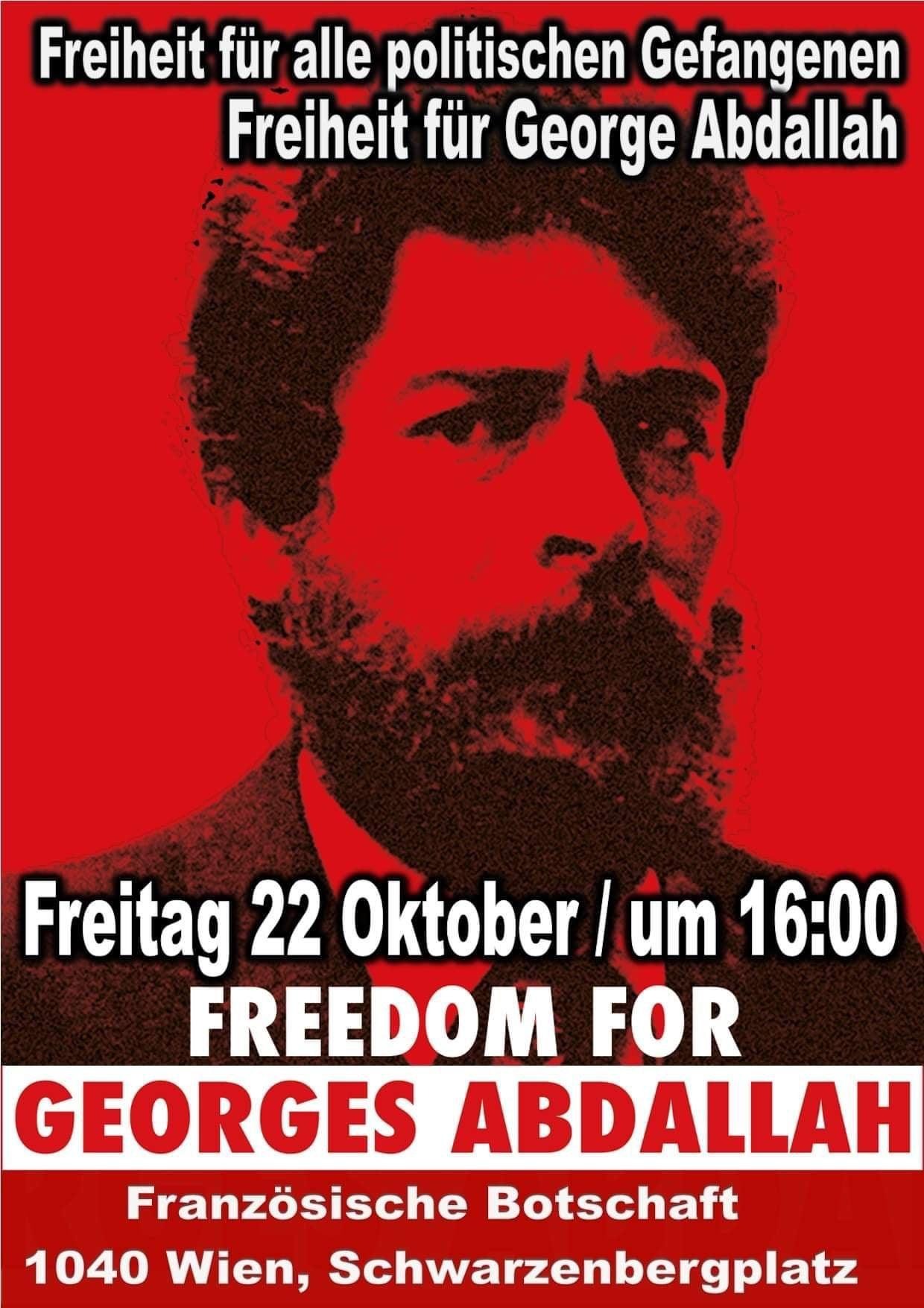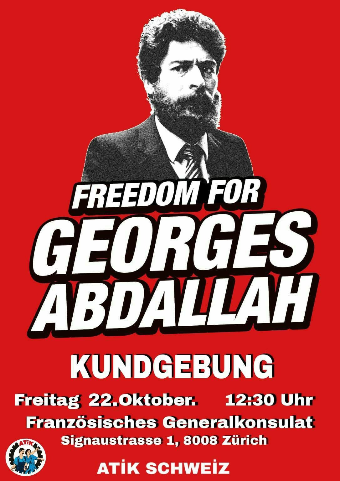 Saturday, 23 October – Demonstration to free Georges Abdallah 2 pm, from the train station in Lannemezan, France to the prison where Georges Abdallah is held. Free bus from Toulouse — email collectifpalestinevaincra@gmail.com to participate!