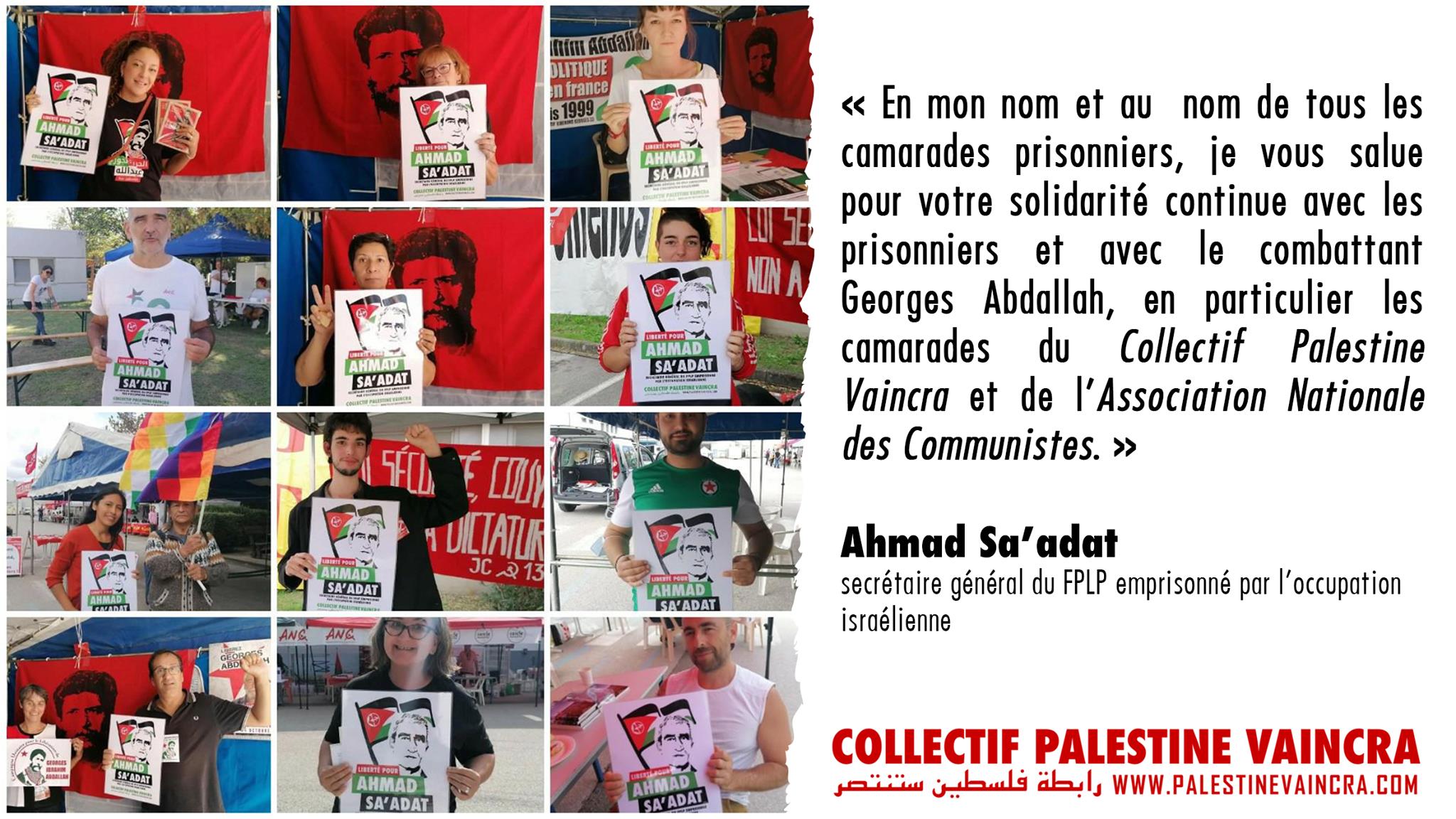 It is more relevant than ever at a time when the French State continues to keep Georges Abdallah in prison, without the extradition notice being signed by the Minister of the Interior as per the condition of his release. It is also more relevant than ever at a time when Georges Abdallah continues to confront his jailers, not to give in, to resist and where the mobilization for his release is growing ever stronger, day after day: everywhere in France, the initiatives to demand his release are carried out with elected officials, in the heart of cities and in front of the authorities of the State, with poster campaigns, gatherings and tables, during meetings, meals and solidarity celebrations, by calls for signatures and letters sent to the highest representative of the State, during political party events, and naturally within the process of all social and political struggles. Georges Abdallah, on a daily basis, is part of our struggles and no action is carried out without our reaffirming that we are part of his fight. This commitment in the region and at the national level is now also broad at the international level where Georges Abdallah has supporters on almost all continents (in Latin America – in Brazil, Mexico, Argentina, Chile, the United States, in the Maghreb and in the Arab East – in particular in Palestine and Lebanon, India, Europe).