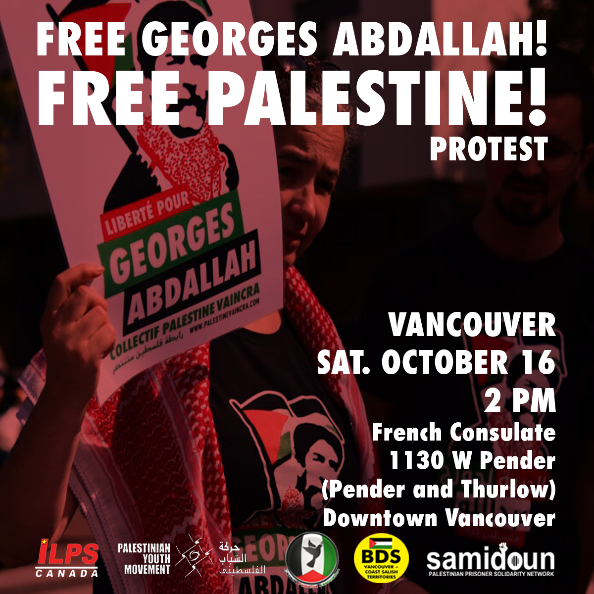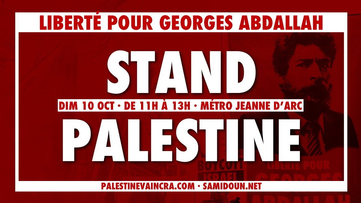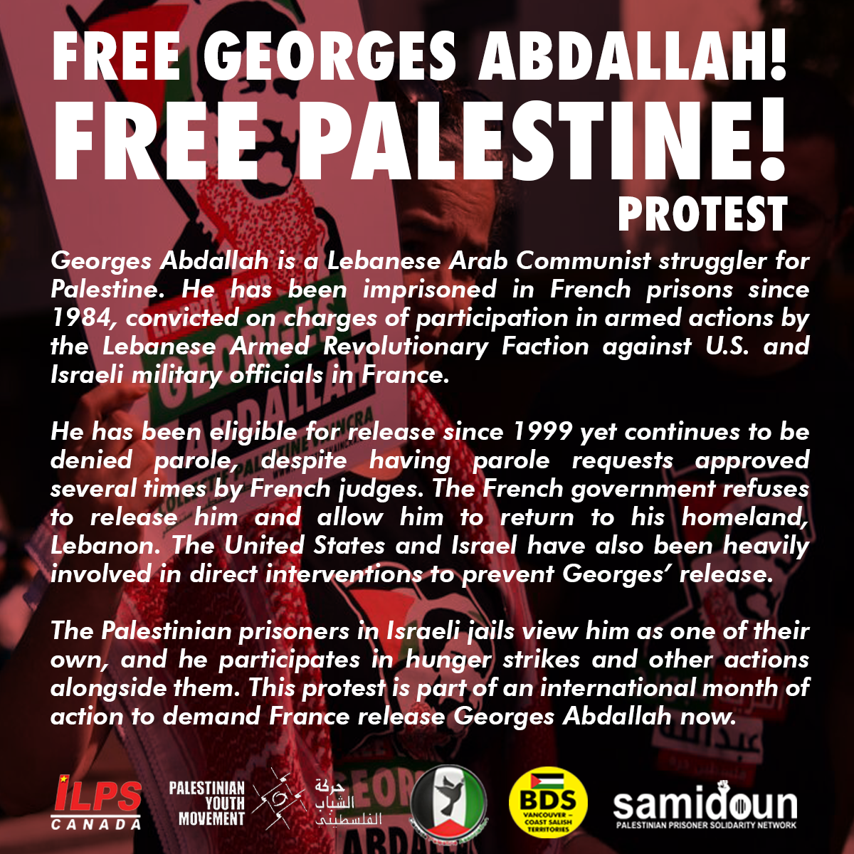 First signatories :Unitary campaign for the liberation of Georges Abdallah – Collective for the liberation of Georges Ibrahim Abdallah (CLGIA) – ANC (National Association of Communists) – The Workers’ Party of Turkey (DIP) – The Red Internationalist Collective for the Defense of Revolutionary Prisoners ( Le CRI Rouge) – Friends of Palestine against imperialism and Zionism (Turkey) – Committee of actions and support for the struggles of the Moroccan people – Committee for Popular Defense of Tunisia – Committee for the Respect of Freedoms and Rights de l’Homme en Tunisie – Secours Rouge International – Secours Rouge de Belgique – Secours Rouge arabe – The Belgian Appeal for the release of Georges Ibrahim Abdallah – Union syndicale solidaire – Collectif 65 for the release of Georges Abdallah – Samidoun Palestinian Prisoner Solidarity NEtwork – UL CGT Paris 18e – Collectif Palestine Vaincra – The Couserans-Palestine Association – Dimitri Konstantakopoulos, journalist and writer, former member of the Secretariat of the Central Committee of SYRIZA (Greece) – International Committee in Support of the People’s War in India (Italy) – Proletari comunisti (Italy) ) – Soccorso rosso proletario (Italy) – Aline Pailler – AFPS 63 – Solidaire 31 – Revolutionary Youth League – A2C (Class autonomy) – Dominique Grange (Committed singer) – Tardi (Cartoonist) – Jean-Pierre Bastid and Emmanuelle de Bagnolet – Alima Boumediene Thiéry – Association Femmes Plurielles – Marie-France Pelletan (Ajaccio) – Helmuth Rudloff (Geneva) – René Naba, journalist-writer – Lise Bouzidi Vega, radio host and activist – Association Terre et Liberté pour Arauco – Ismaël Dupont,elected communist in Morlaix and in the department of Finistère, secretary of the PCF Finistère – José Navarro – Annick Weiner, professor emeritus – The International Support Network for Political Prisoners in Chile, (RIAPPECH) – the Charleroi-Palestine Platform – Youssef Boussoumah (decolonial HQ) and Houria Bouteldja (decolonial HQ) – Poitevin Palestine Committee – United Front for Immigration and Popular Quarters (FUIQP) – Association of Residents of Nanterre (ARENE) – Tunisian Solidarity Committee for Liberation by Georges Abdallah – Union Juive Française pour la Paix (UJFP) – Union Prolétarienne ML (UPML) – AFPS d’Albertville – AFPS Paris 14-6 -Arab Commission for Human Rights-professor emeritus – The International Support Network for Political Prisoners in Chile, (RIAPPECH) – the Charleroi-Palestine Platform – Youssef Boussoumah (decolonial HQ) and Houria Bouteldja (decolonial HQ) – Poitevin Palestine Committee – United Front of Immigration and Popular Quarters (FUIQP) – The Association of Residents of Nanterre (ARENE) – Tunisian Solidarity Committee for the Liberation of Georges Abdallah – Union Juive Française pour la Paix (UJFP) – Union Prolétarienne ML (UPML) ) – AFPS d’Albertville – AFPS Paris 14-6 -Arab Commission for Human Rights-professor emeritus – The International Support Network for Political Prisoners in Chile, (RIAPPECH) – the Charleroi-Palestine Platform – Youssef Boussoumah (decolonial HQ) and Houria Bouteldja (decolonial HQ) – Poitevin Palestine Committee – United Front of Immigration and Popular Quarters (FUIQP) – The Association of Residents of Nanterre (ARENE) – Tunisian Solidarity Committee for the Liberation of Georges Abdallah – Union Juive Française pour la Paix (UJFP) – Union Prolétarienne ML (UPML) ) – AFPS d’Albertville – AFPS Paris 14-6 -Arab Commission for Human Rights-(RIAPPECH) – the Charleroi-Palestine Platform – Youssef Boussoumah (decolonial HQ) and Houria Bouteldja (decolonial HQ) – Poitevin Palestine Committee – United Front for Immigration and Popular Quarters (FUIQP) – Association of Residents of Nanterre (ARENE) – Tunisian Solidarity Committee for the Liberation of Georges Abdallah – French Jewish Union for Peace (UJFP) – Union Prolétarienne ML (UPML) – AFPS d’Albertville – AFPS Paris 14-6 – Arab Commission for Human Rights(RIAPPECH) – the Charleroi-Palestine Platform – Youssef Boussoumah (decolonial HQ) and Houria Bouteldja (decolonial HQ) – Poitevin Palestine Committee – United Front for Immigration and Popular Quarters (FUIQP) – Association of Residents of Nanterre (ARENE) – Tunisian Solidarity Committee for the Liberation of Georges Abdallah – French Jewish Union for Peace (UJFP) – Union Prolétarienne ML (UPML) – AFPS d’Albertville – AFPS Paris 14-6 – Arab Commission for Human Rights