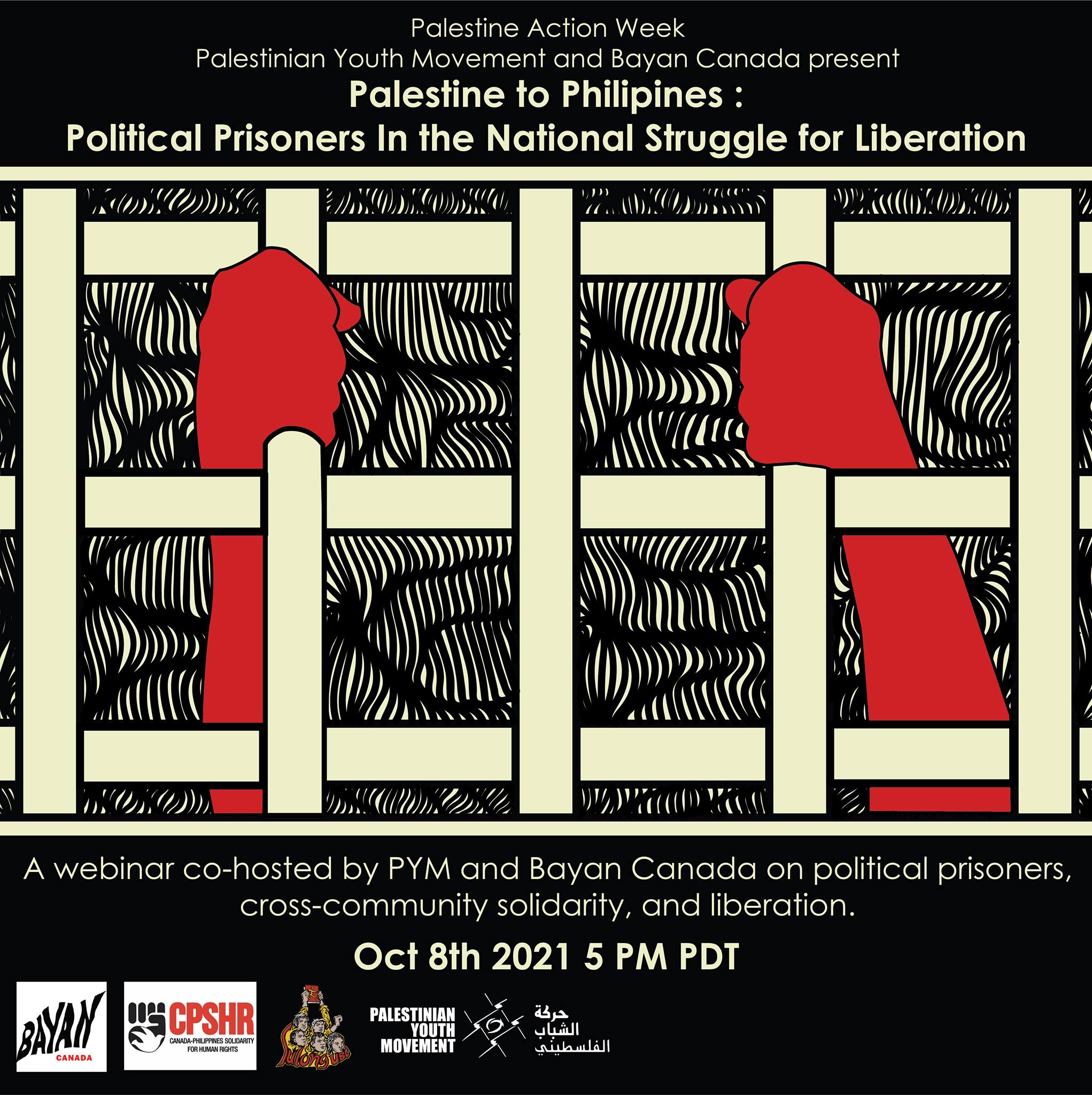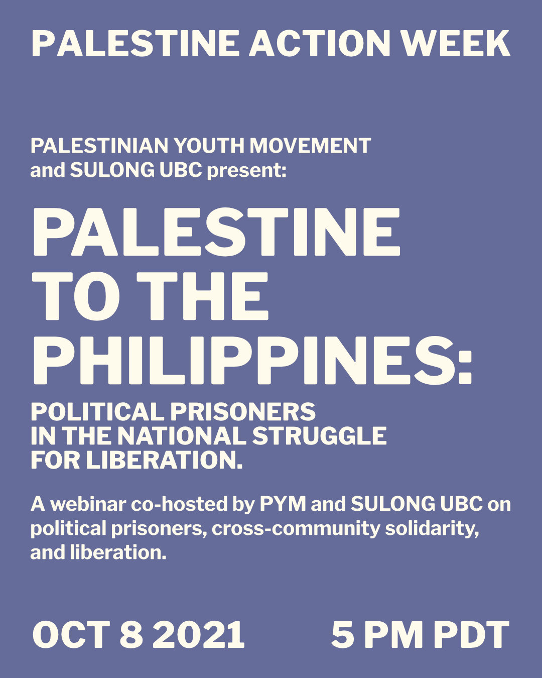Palestine to the Philippines: Political Prisoners in the national struggle for liberation. A webinar co-hosted by Palestinian Youth Movement and Sulong UBC on political prisoners, cross-community solidarity, and liberation. October 8 at 5PM PDT.