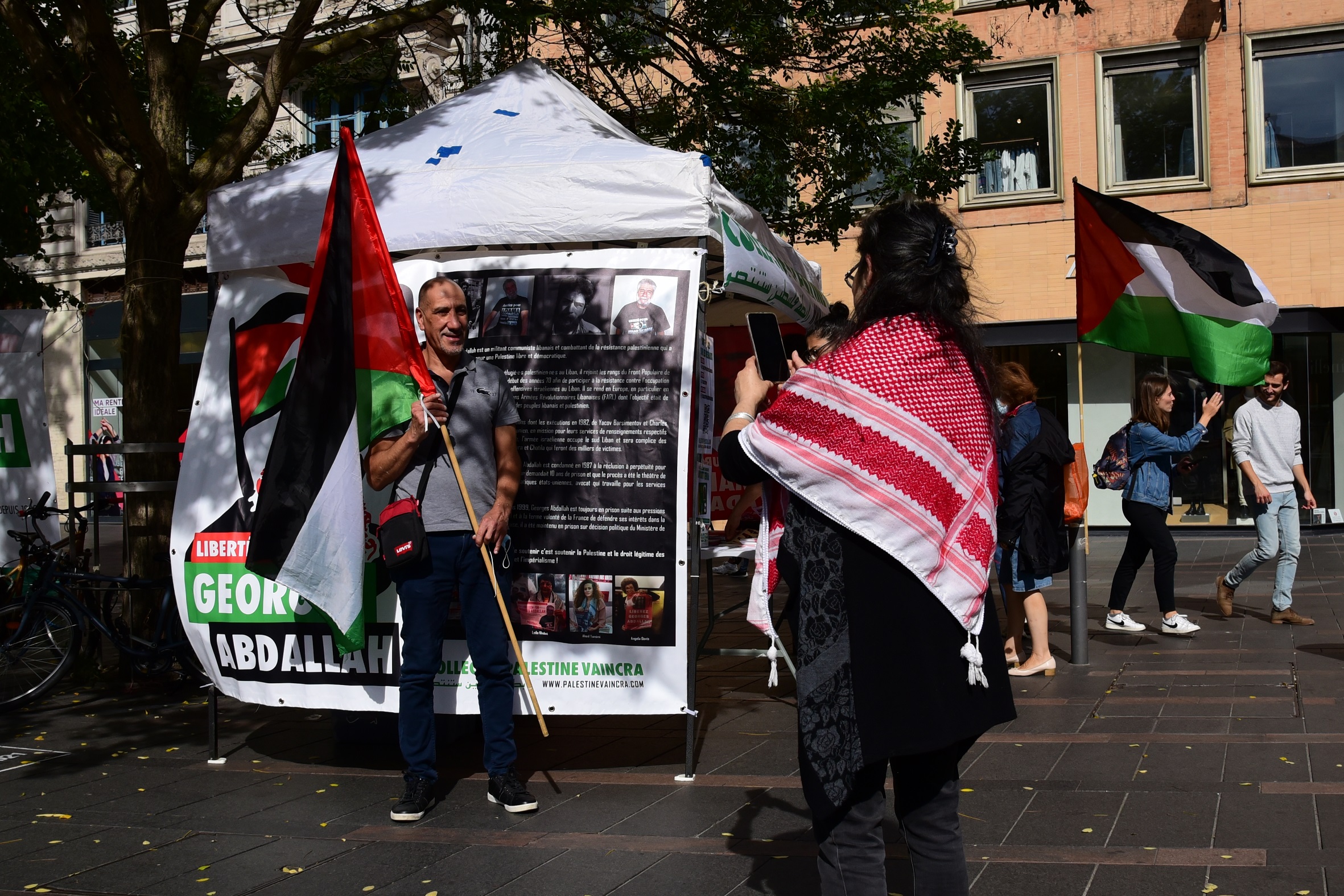 On Saturday, 2 October, the Collectif Palestine Vaincra — a member organization of the Samidoun Network — organized a Palestine Stand from 11 am to 1 pm outside the Capitole metro station in Toulouse, France. The stand was organized as part of the ongoing month of action for the release of Georges Ibrahim Abdallah, the Lebanese Communist and freedom fighter for Palestine imprisoned in French jails since 1984, despite being eligible for release since 1999.