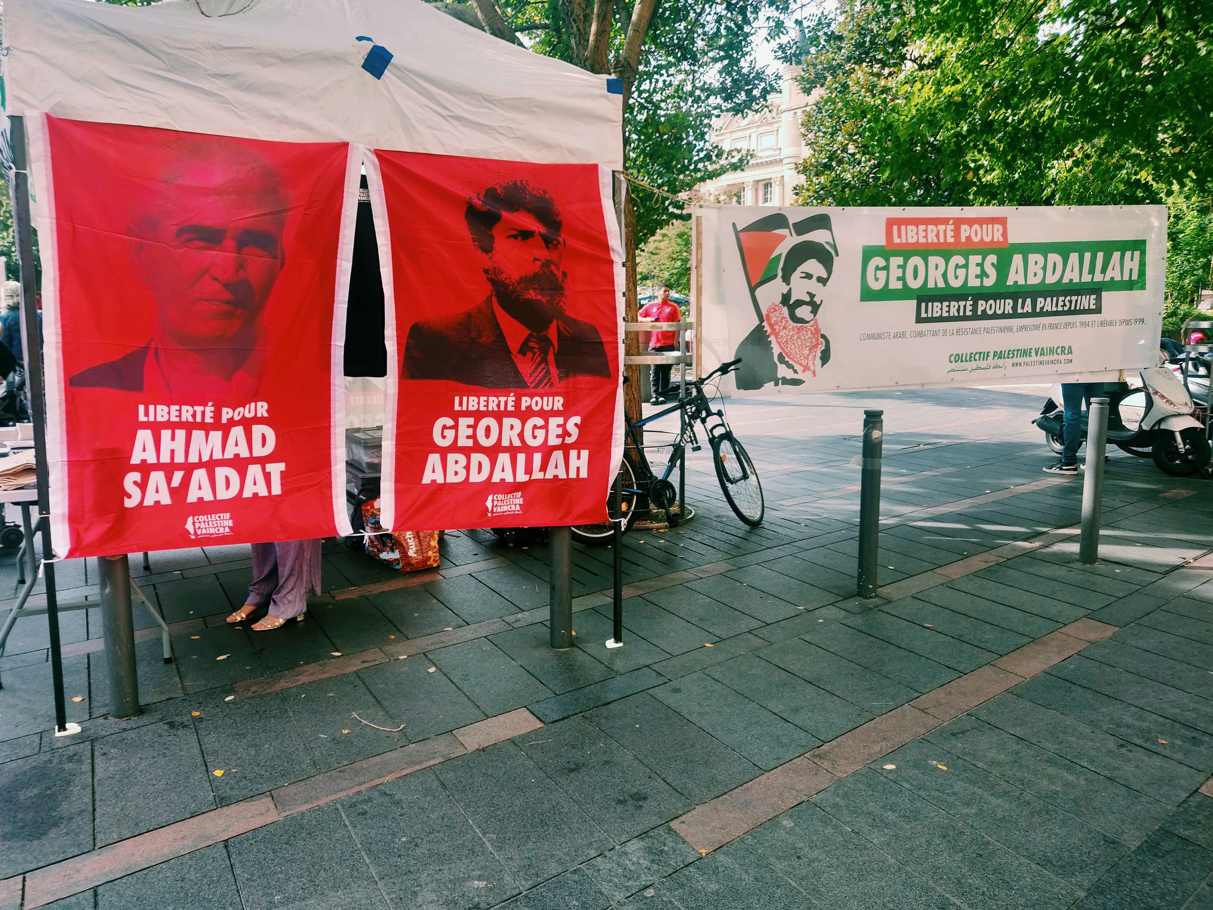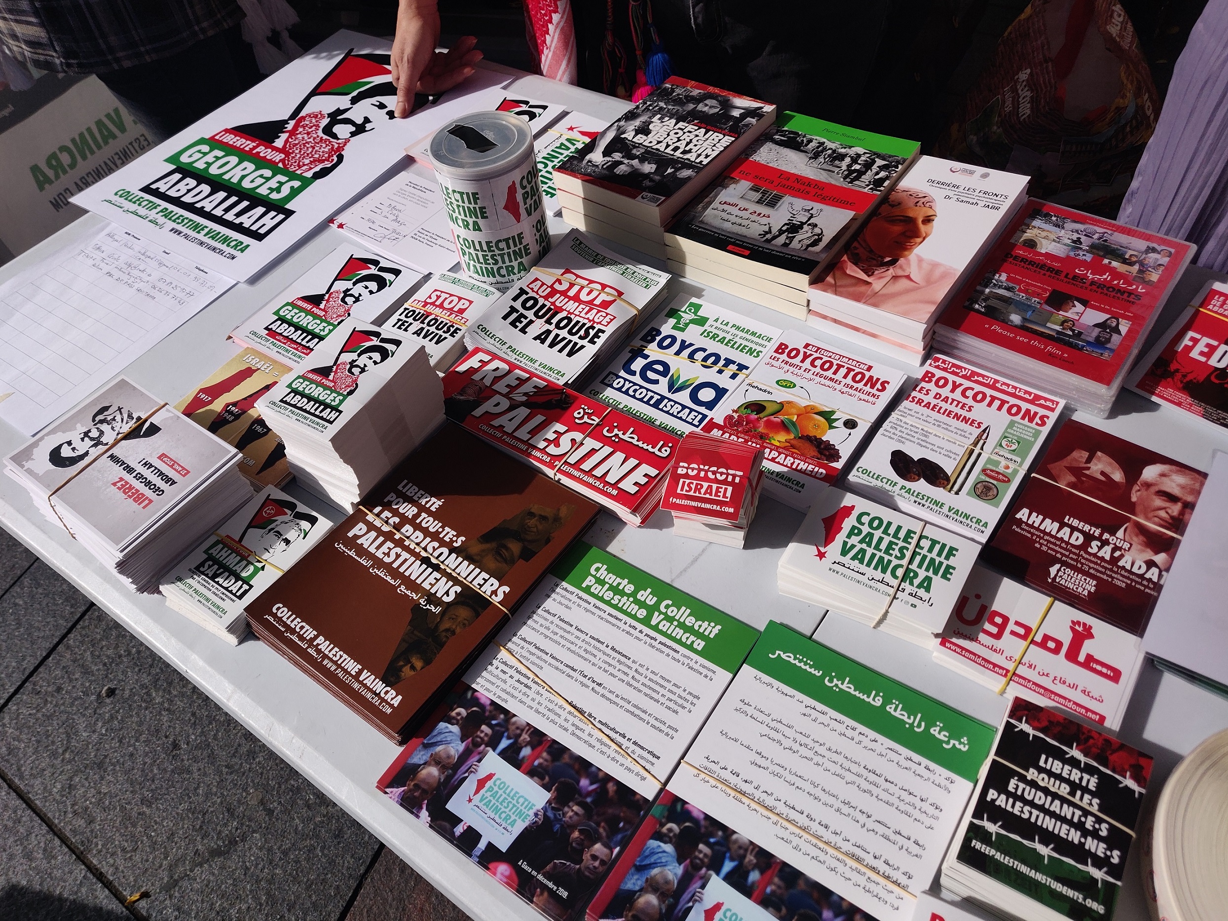 Amid a sunny day, the Collectif installed several large banners calling for the freedom of Georges Abdallah and Ahmad Sa’adat, the imprisoned general secretary of the Popular Front for the Liberation of Palestine. The stand was surrounded by Palestinian flags, and activists offered free stickers, flyers and leaflets to passers-by. The stand also offered books, including the new book by Said Bouamama, The Georges Abdallah Affair. Many people were attracted by a large explanatory banner presenting the history of Georges Abdallah’s case and struggle.