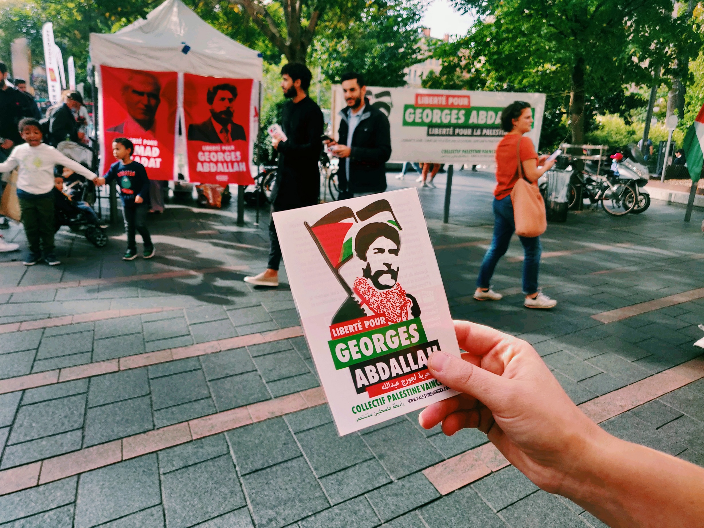 At the stand, you will find flyers, t-shirts, Palestinian flags and copies of the excellent book, “The Georges Ibrahim Abdallah Affair,” by Said Bouamama. There will be a photo booth to show your solidarity.