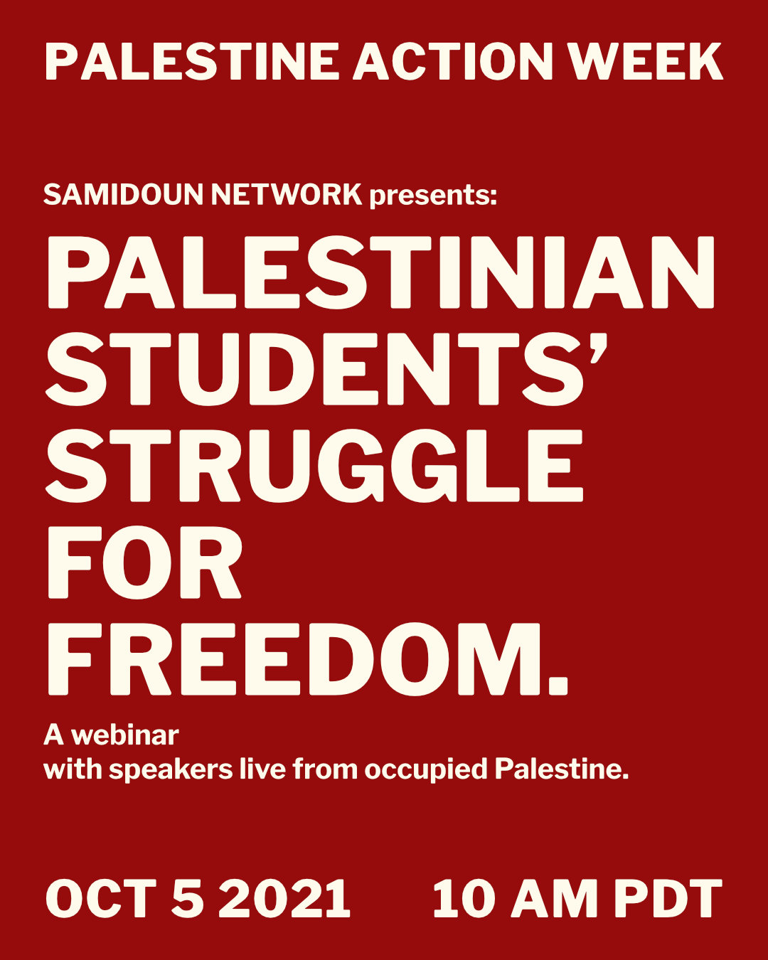 Palestinian Students’ Struggle for Freedom. A webinar with speakers live from Occupied Palestine, including recently released Palestinian prisoner Layan Kayed and Samidoun Palestine coordinator Hadeel Shatara. October 5 at 10 AM PDT.