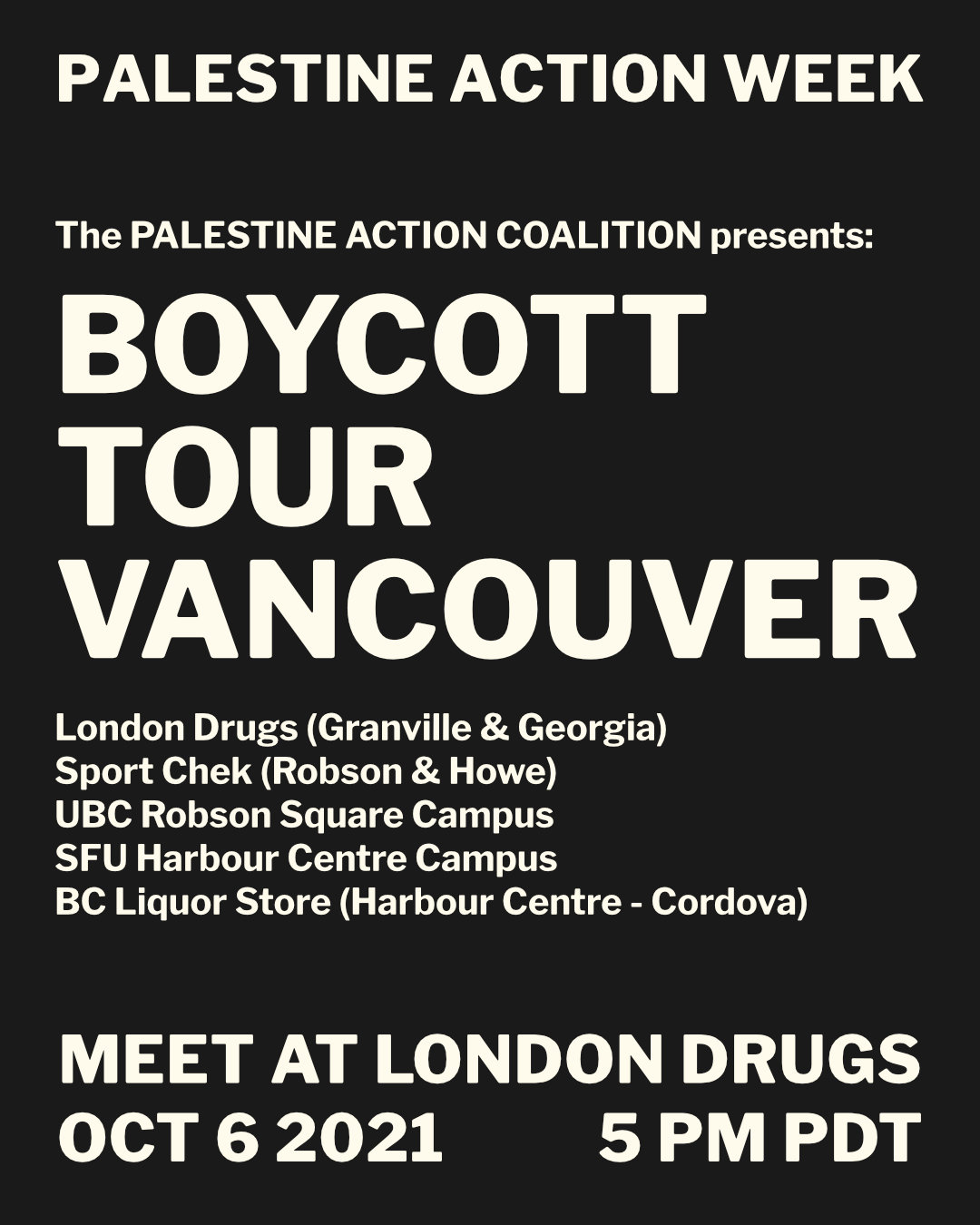 March for Palestine in the Boycott Tour Vancouver. London Drugs (Granville and Georgia), Sport Chek (Robson and Howe), UBC Robson Square, SFU Harbour Centre, and BC Liquor Harbour Centre. October 6 at 5 PM PDT. Gather at Granville and Georgia Facebook Event: https://www.facebook.com/events/1131774907353614