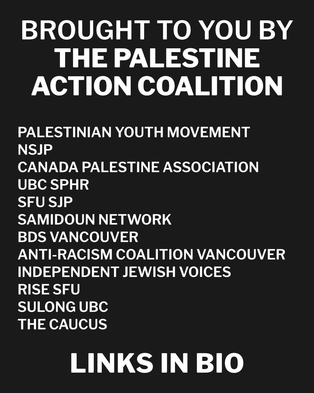 Brought to you by the Palestine Action Coalition: Palestinian Youth Movement, NSJP, Canada Palestine Association, UBC SPHR, SFU SJP, Samidoun Network, BDS Vancouver, Anti-racism coalition Vancouver, Independent Jewish Voices, Rise SFU, Sulong UBC, and the Caucus.