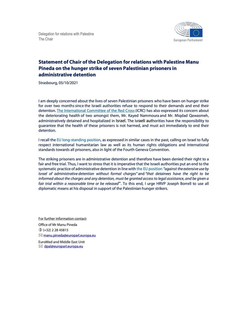 Manu Pineda, Member of European Parliament and Chair of the Delegation on relations with Palestine, emphasized his urgent concern for their lives in a statement: