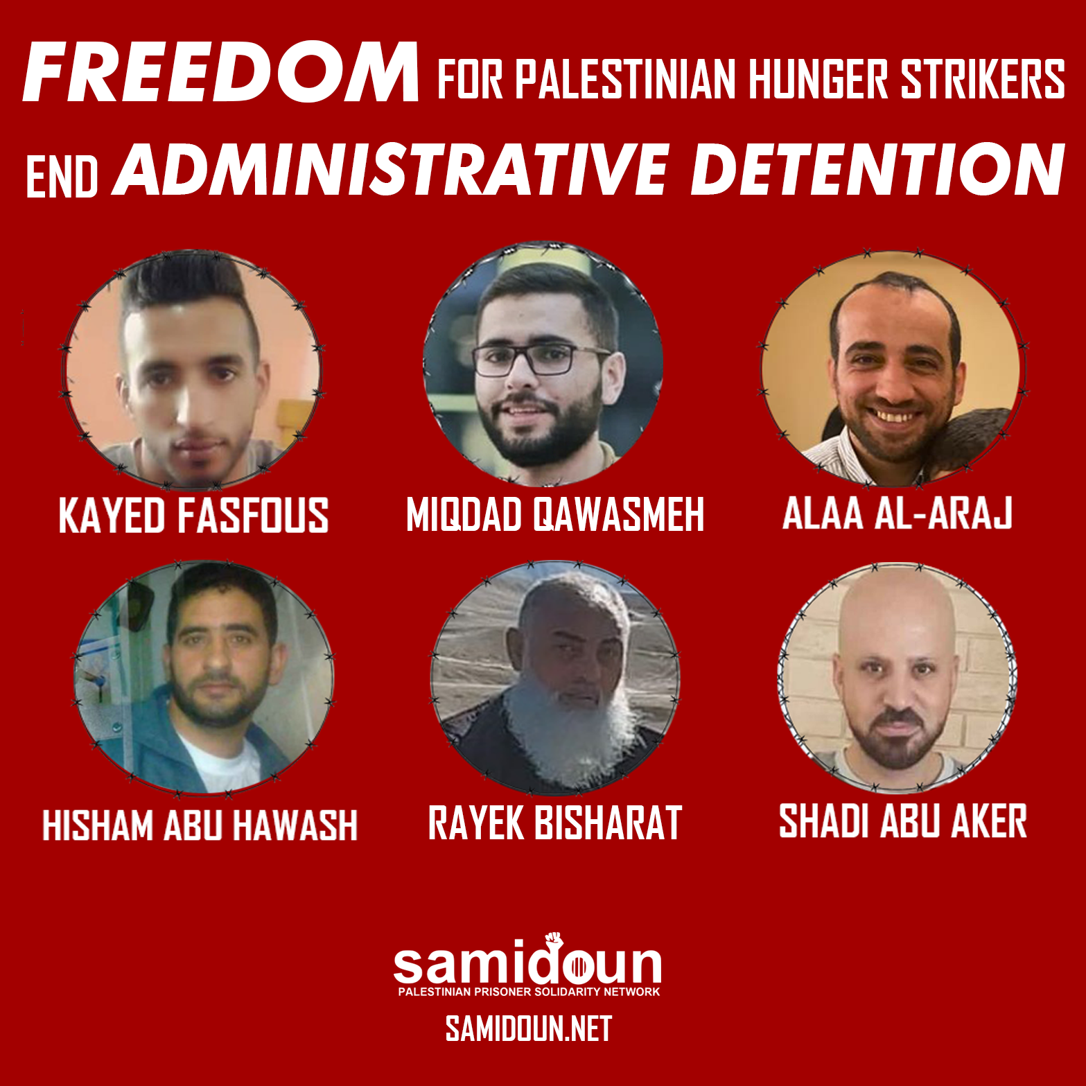 Samidoun Palestinian Prisoner Solidarity Network urges all supporters of Palestine to take action to support these Palestinian hunger strikers and all Palestinian prisoners struggling for freedom, for their own lives and for the Palestinian people. They are confronting the system of Israeli oppression on the front lines, with their bodies and their lives, to bring the system of administrative detention to an end. Take these actions below to stand with the hunger strikers and the struggle for liberation of Palestine, from the river to the sea!