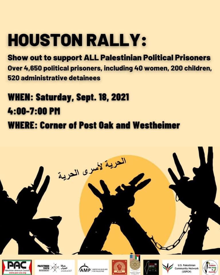 Cosponsors: Palestinian Youth Movement, Palestinian American Council – Pac-USA, Palestinian American Cultural Center- PACC Houston, US Palestinian Community Network, American Muslims for Palestine, RISE, Students for Justice in Palestine at UH, and SJP @ UH Clearlake
