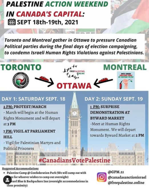 Ottawa – Saturday, 18 September, 2 pm, Protest and March, Human Rights Monument; 7 pm, Vigil at Parliament Hill for Palestinian Martyrs and Political Prisoners. Info: https://www.instagram.com/p/CTze3Nfr-jk/