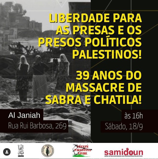 Sao Paulo – Saturday, 18 September, 4 pm, Al Janiah, Rua Rui Barbosa 269, Bela Vista, Sao Paulo/SP, Support Palestinian Prisoners and Remember Sabra and Shatila. Info: https://www.instagram.com/p/CT0Sz59vC0C/
