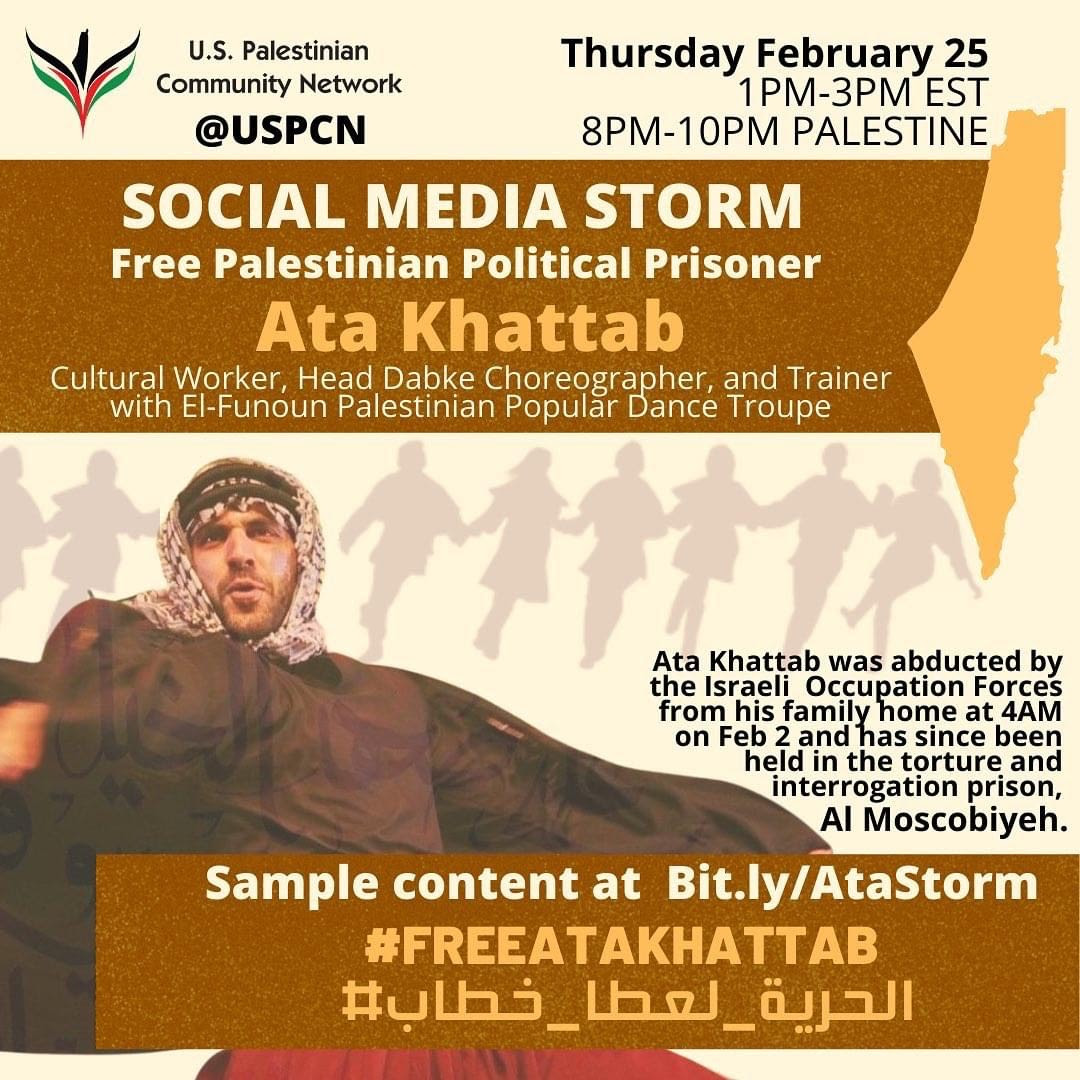 Join USPCN this Thursday, February 25th, at 1 PM Eastern Time (8 PM in Palestine) for a two hour social media storm to demand that Israel release Palestinian cultural worker Ata Khattab from political imprisonment!
