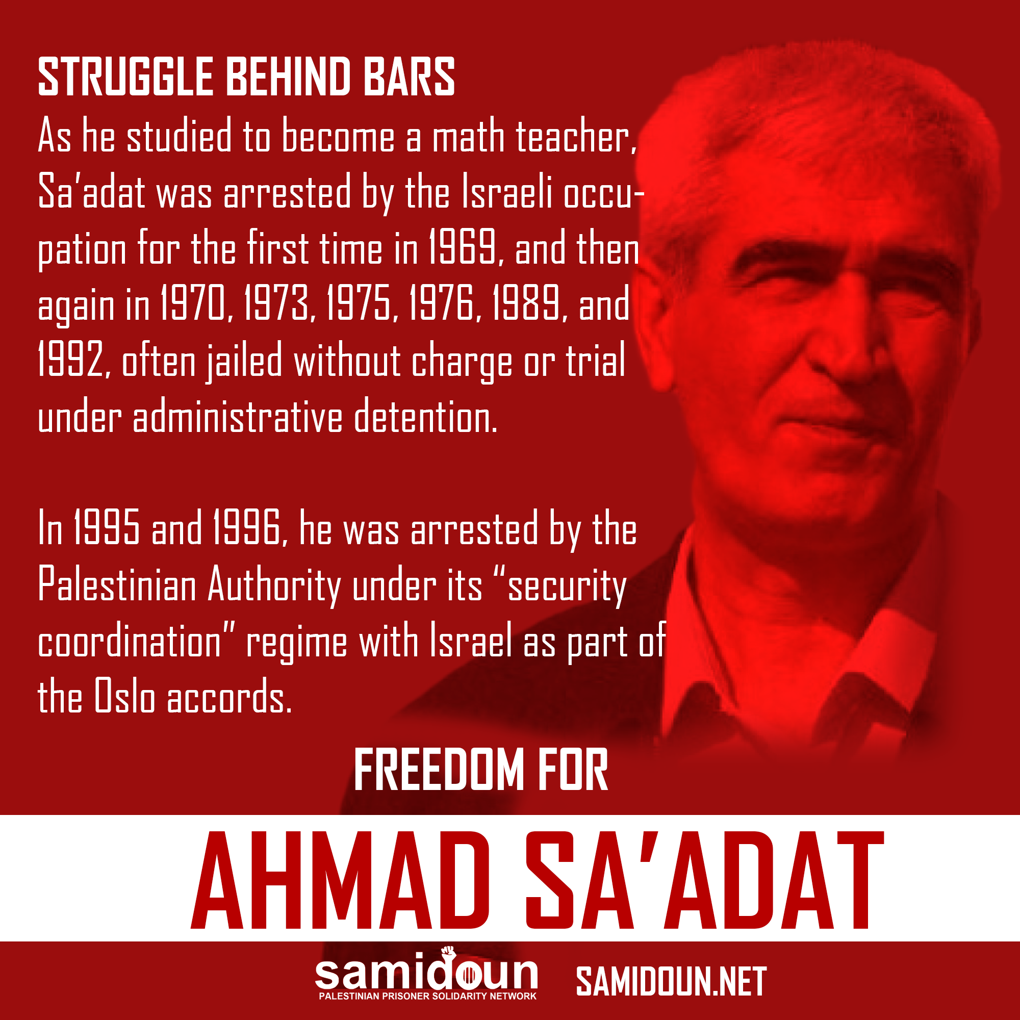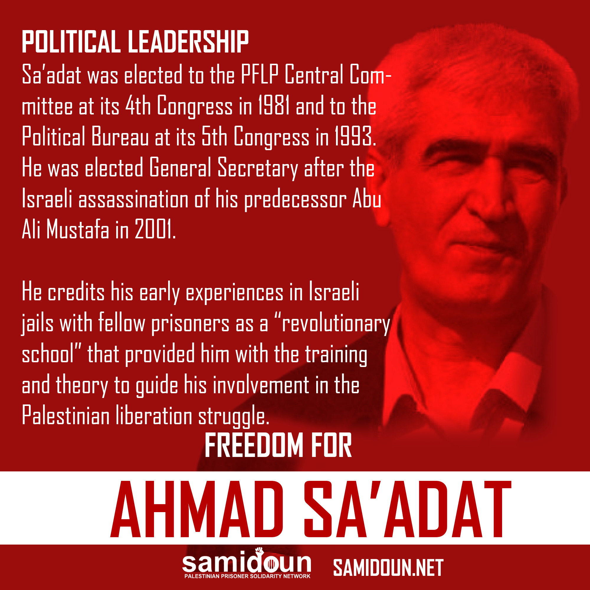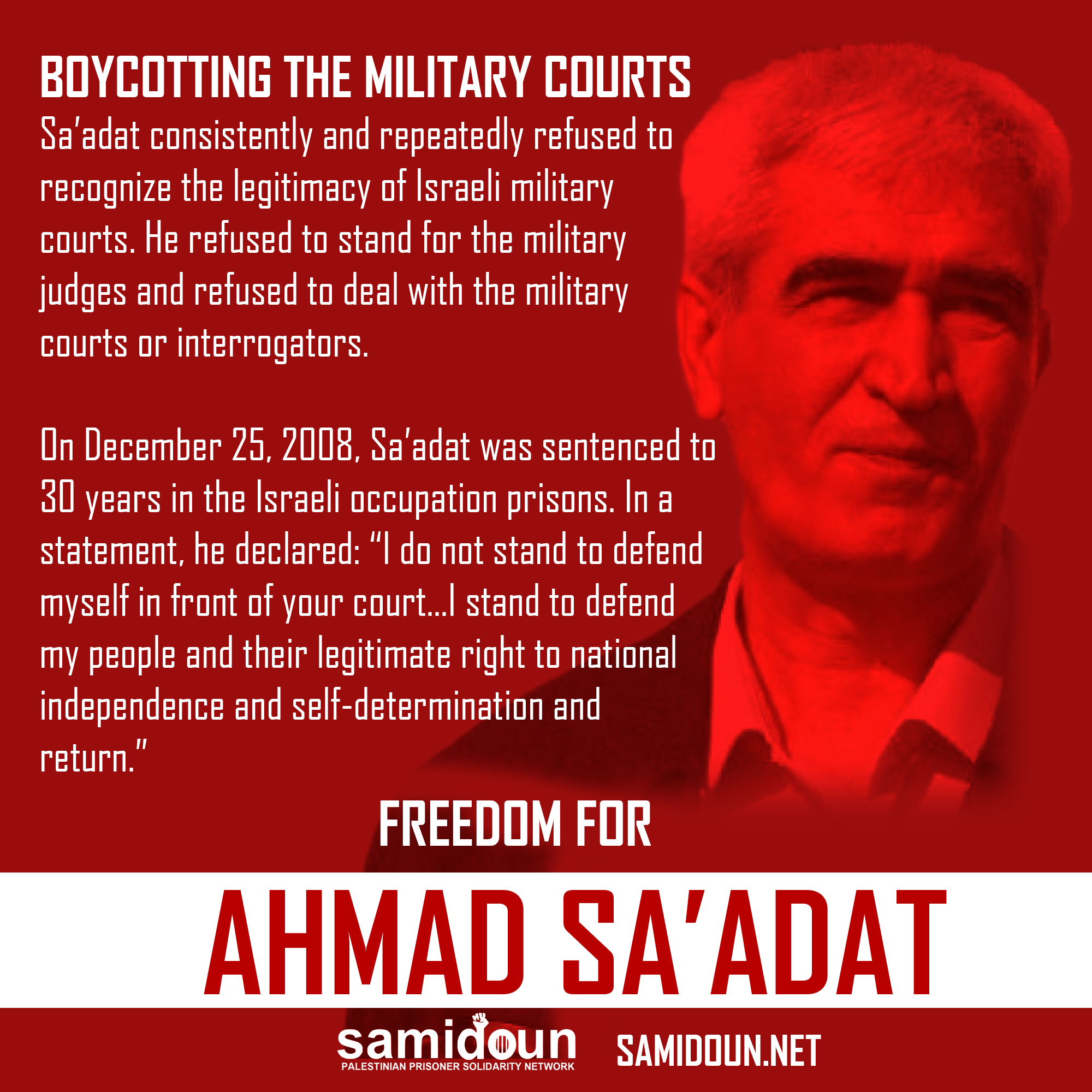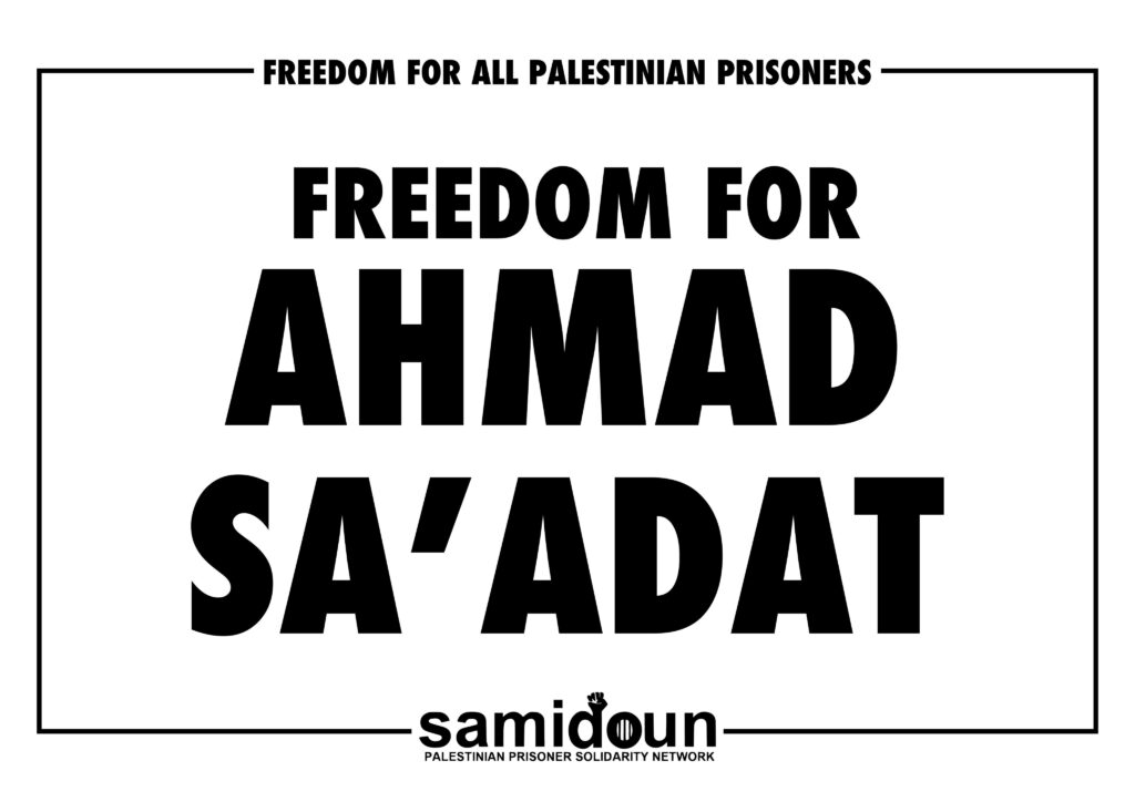 Do you wish to participate in the campaign? Write a sign in support of Ahmad Sa’adat and the Palestinian political prisoners and post it on social media with the hashtag #FreeAhmadSaadat.