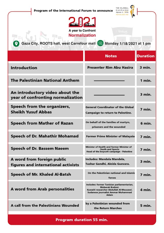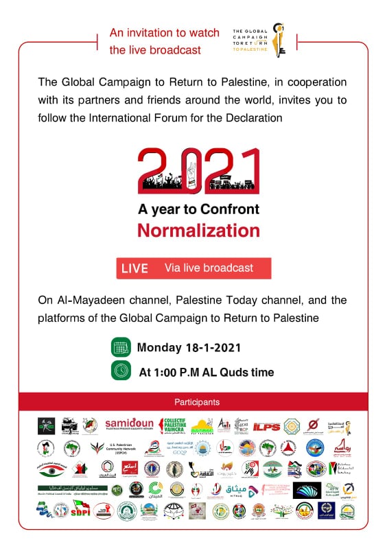 With the participation of international and Arab activists, public figures and personalities the “2021 year to confront normalization” forum will be launched in Gaza tomorrow The Global Campaign for Return to Palestine, in cooperation with 61 partner institutions, is launching the International Forum to launch activities: “2021, year to confront normalization”, with the participation of international and Arab activists. The forum will be held in the besieged Gaza Strip, on Monday 18 – 01 -2021 at 1:00 pm Al Quds Time.