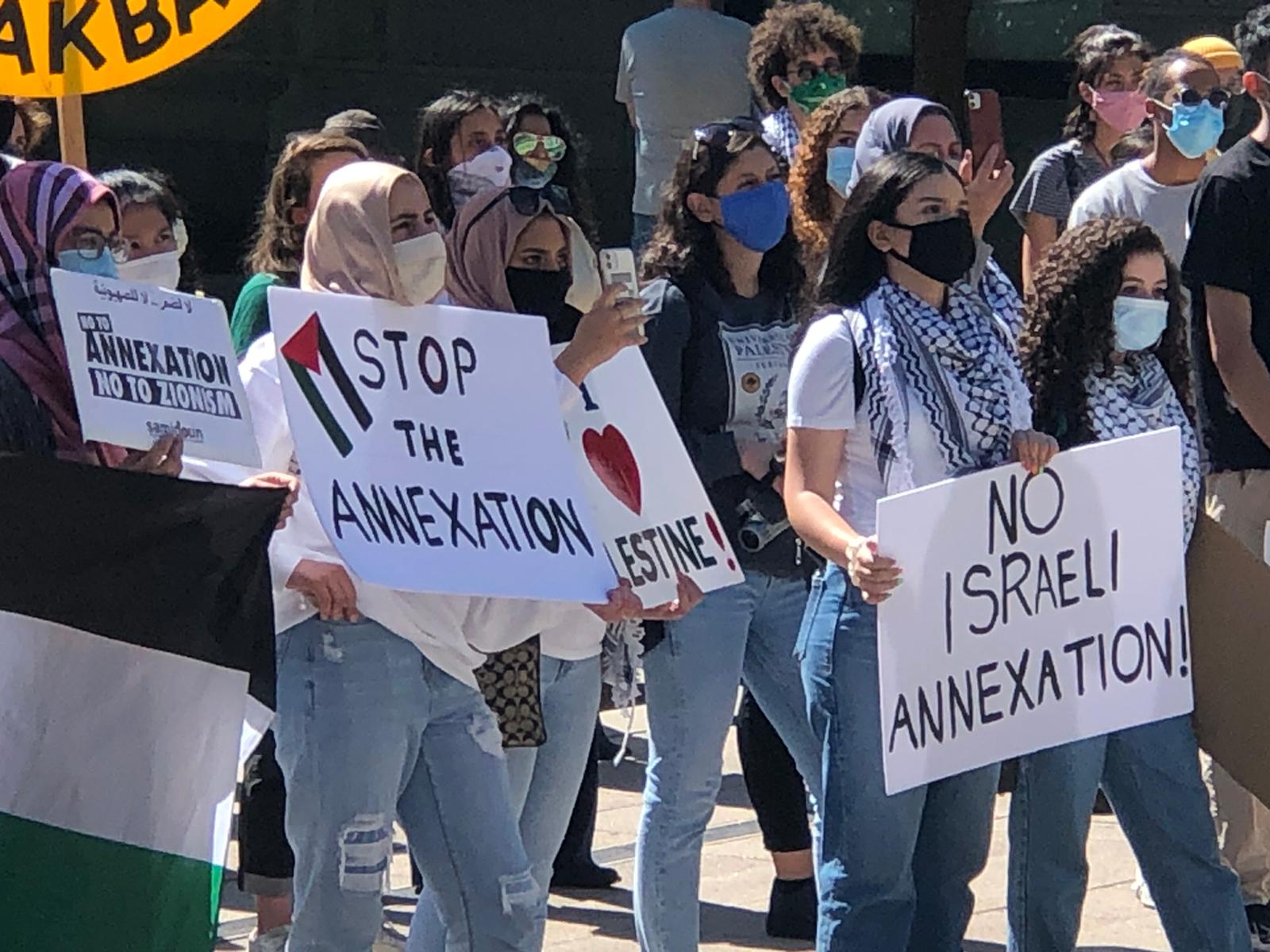 They joined in spirited chants for justice and liberation in Palestine, raising Palestinian flags and signs denouncing annexation.