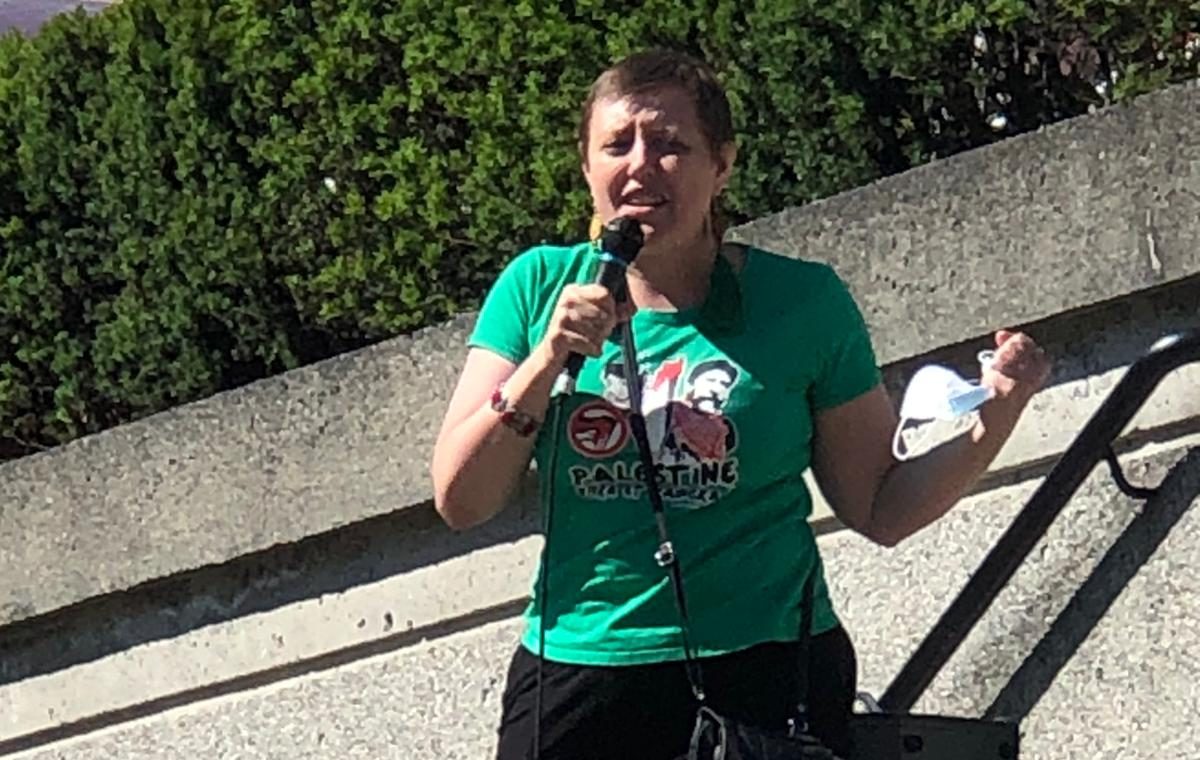 Charlotte Kates, the international coordinator of Samidoun, spoke at the protest, focusing on the situation of Palestinian political prisoners, including the widespread use of torture by Israeli interrogators, the arrest and imprisonment of Palestinian children and the targeting of Palestinian students.