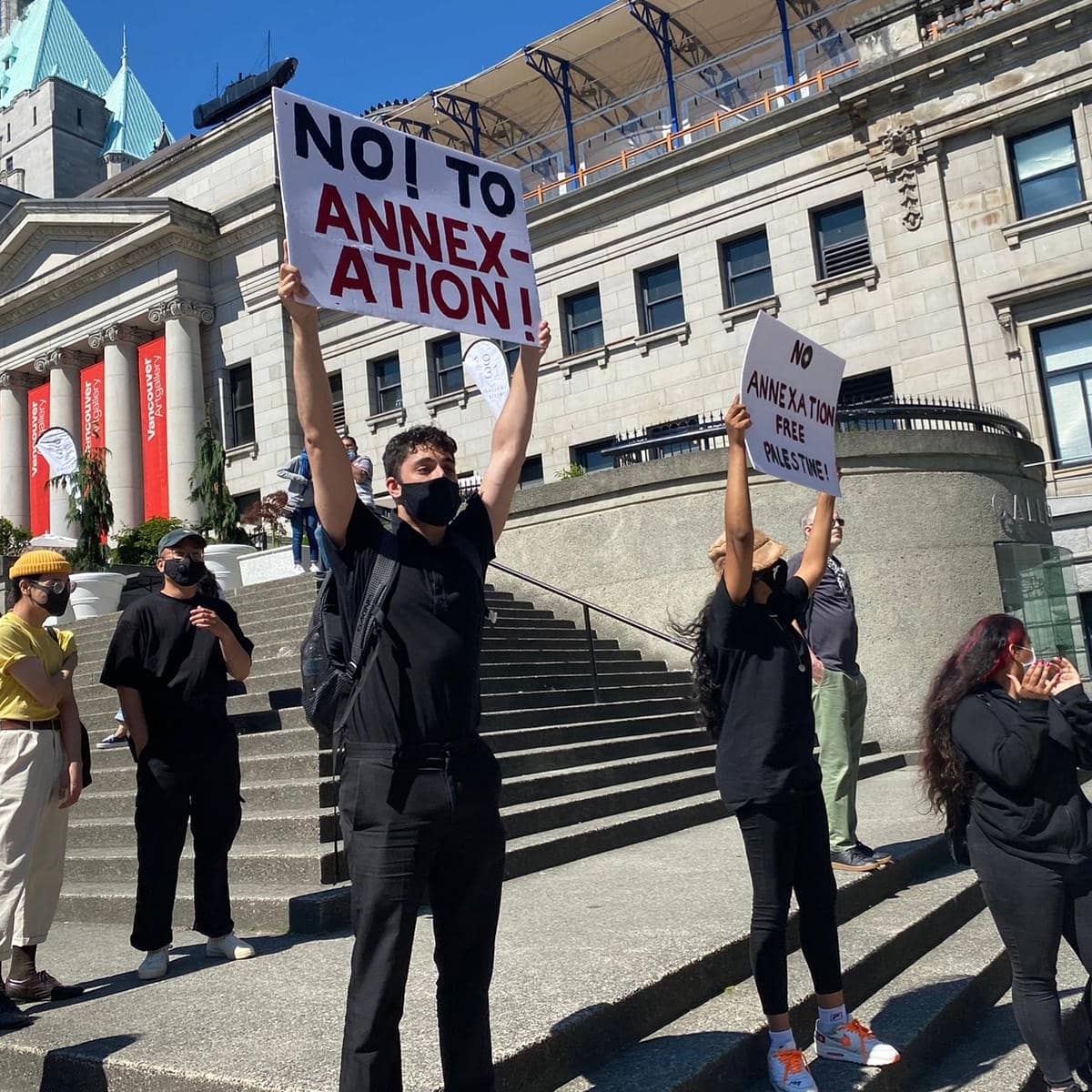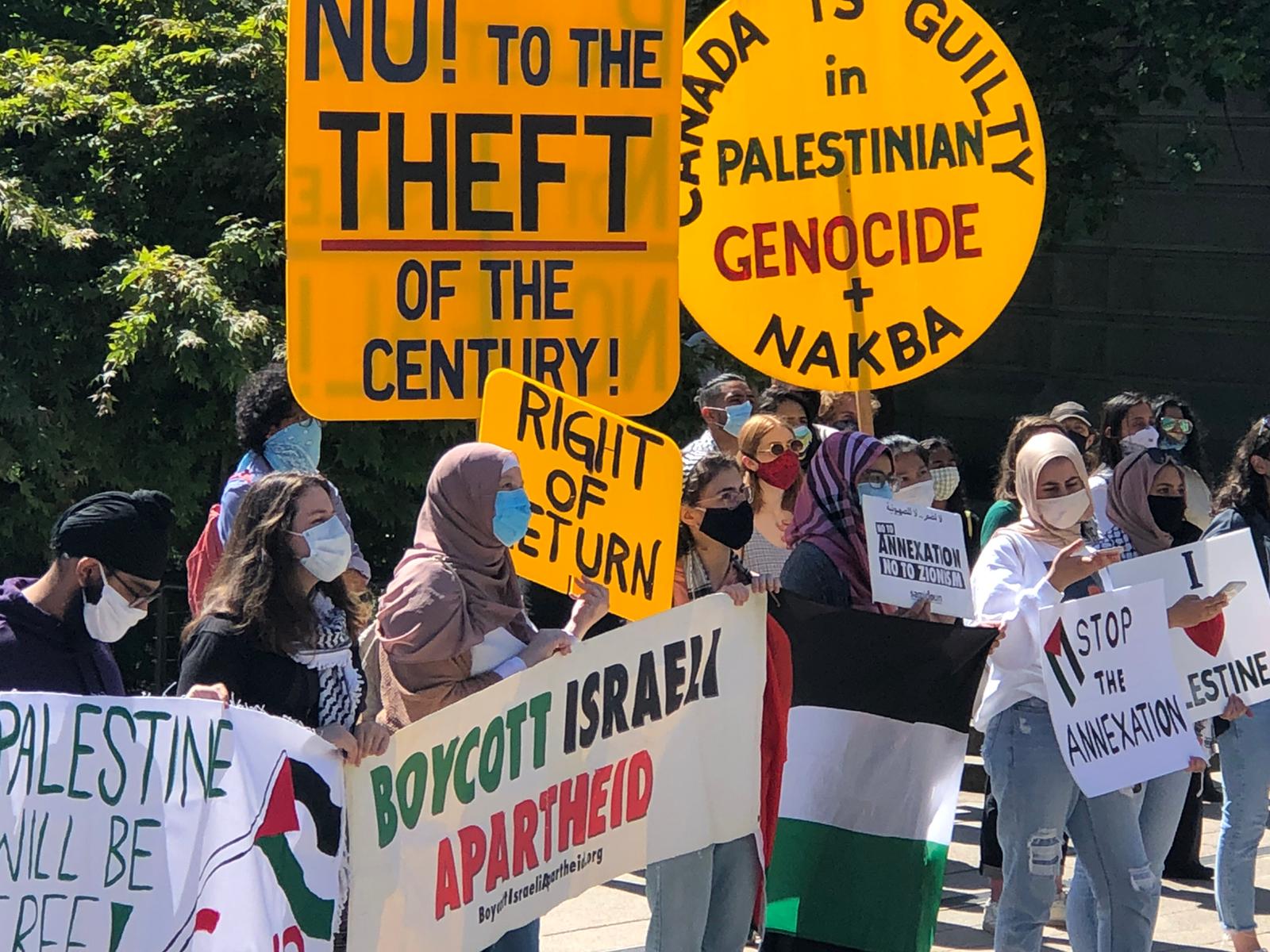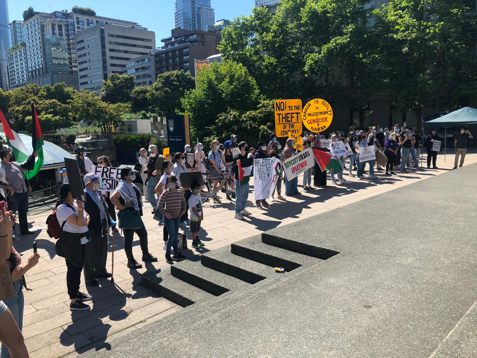 The protest followed an earlier street picket organized on 26 June by the Canada Palestine Association and BDS Vancouver. Protesters lined up at the crowded rush-hour intersection of Broadway and Clark in Vancouver with large signs, banners and Palestinian flags, chanting loudly and denouncing Israeli annexation while demanding justice and liberation for Palestine.