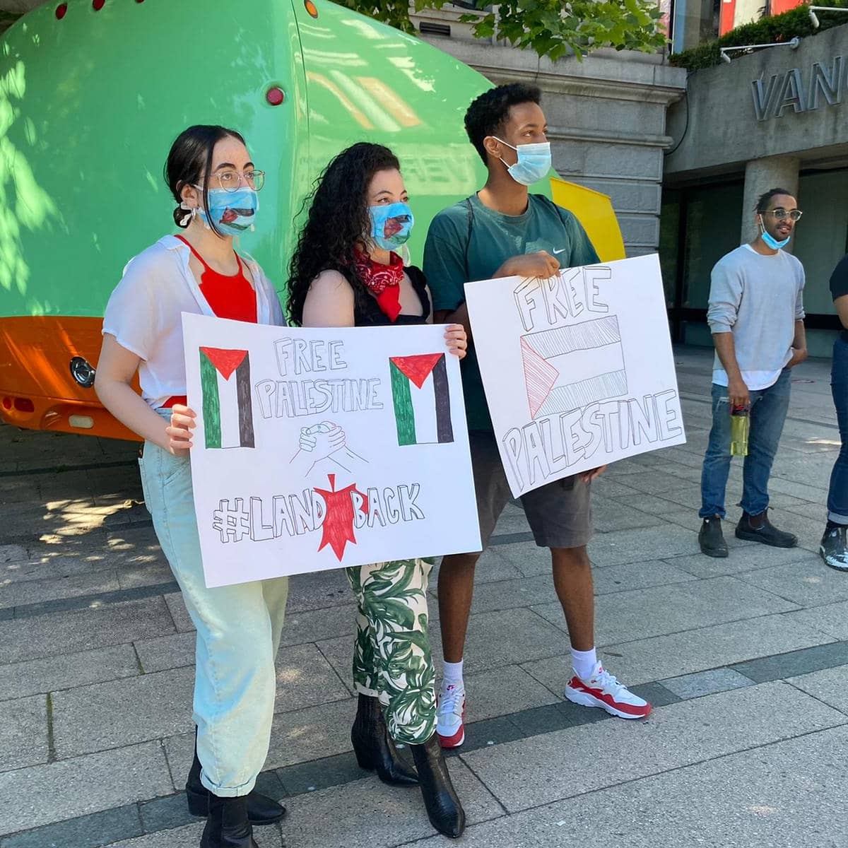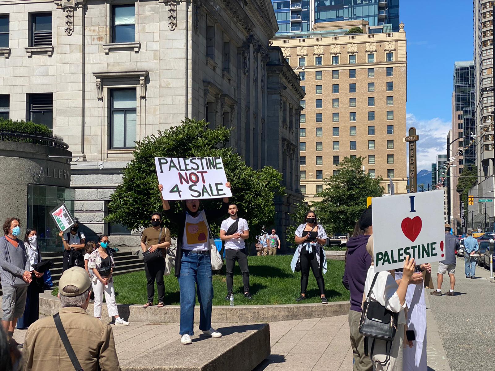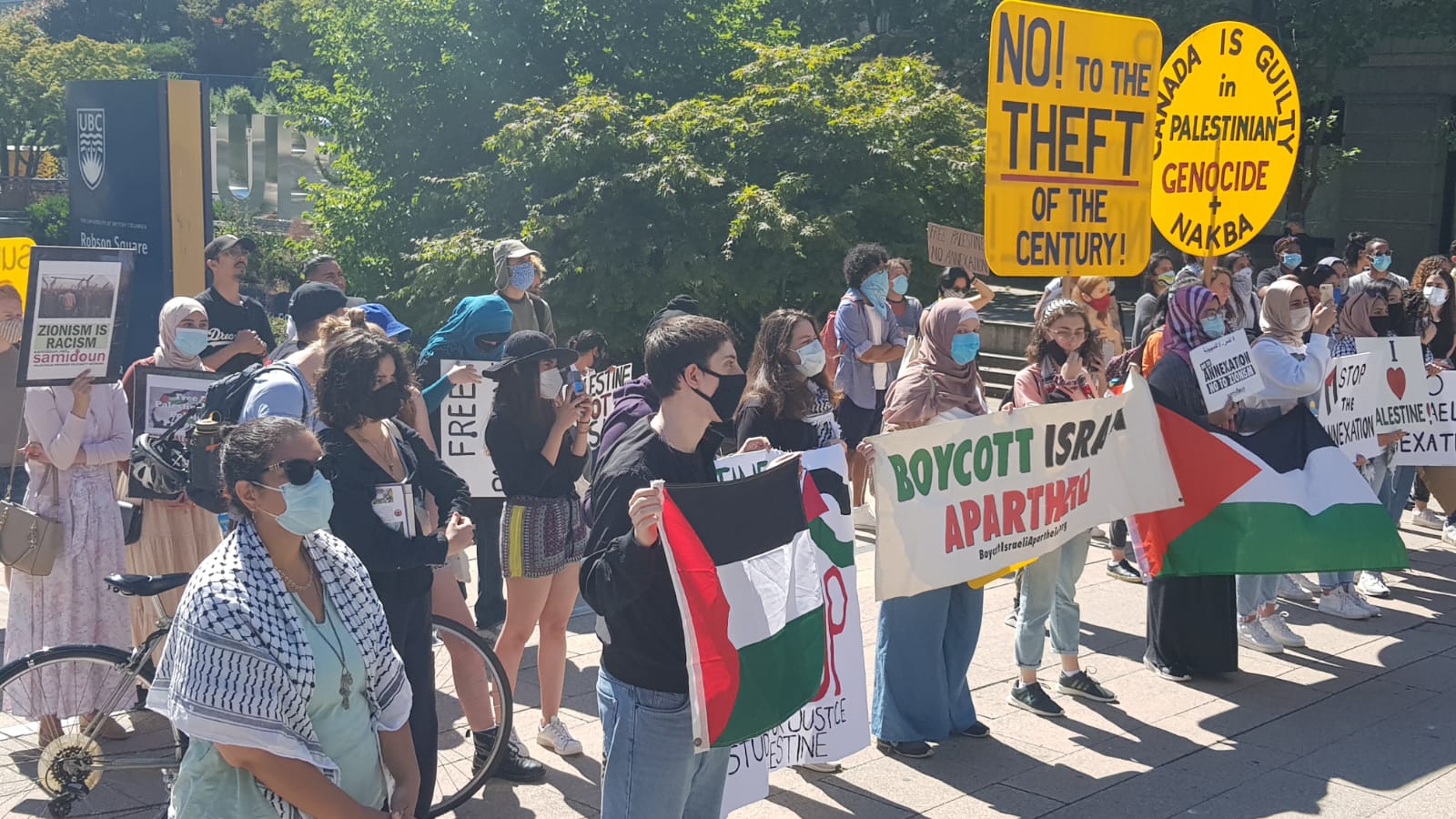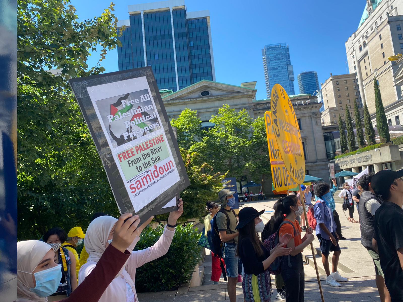 The protest followed an earlier street picket organized on 26 June by the Canada Palestine Association and BDS Vancouver. Protesters lined up at the crowded rush-hour intersection of Broadway and Clark in Vancouver with large signs, banners and Palestinian flags, chanting loudly and denouncing Israeli annexation while demanding justice and liberation for Palestine.