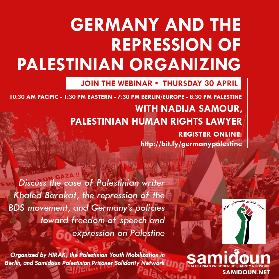 Palestinian lawyer Nadija Samour speaks from Berlin at a special seminar on the issue of writer Khaled Barakat and official German policies towards freedom of opinion and expression in relation to the Palestinian issue, the seminar also discusses attempts to criminalize the international boycott movement and highlight many rights issues similar to Palestinians and Arabs in Germany. On Thursday at 7:30 pm (Germany), 8:30 pm (Palestine) – 10:30 am Pacific, 1:30 pm Eastern, 5:30 PM UTC