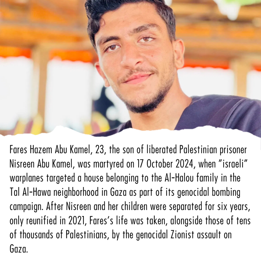 Islam Odeh, 29, was an engineer and a leader in the Al-Qassam Brigades, a graduate of Kadoorie Technical University in Tulkarem, where he was active in the Islamic Bloc as a student activist. As they besieged and attacked the building where he was staying, genocidal occupation forces abducted his mother and father, interrogating his parents and attempting to use them to attempt to force him to surrender and return to Zionist prisons. Despite this, amid his deep love and respect for his parents and family, Islam Jamil Odeh decided to fight the colonial army until his last breath, with which he affirmed his testimony of faith in God.